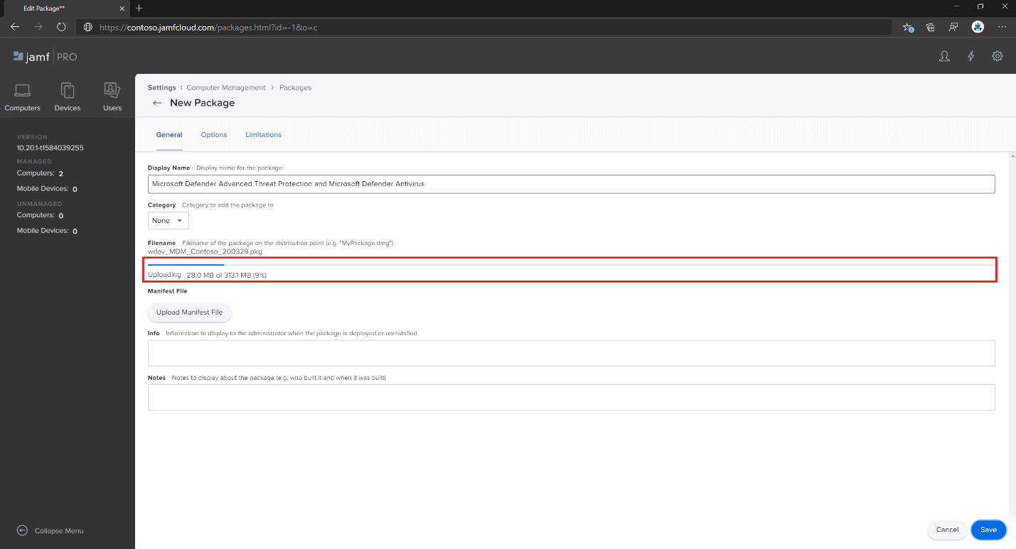 wdav.pkgorwdav_MDM_Contoso_200329.pkg.Select Open. Set the Display Name to Microsoft Defender Advanced Threat Protection and Microsoft Defender Antivirus.