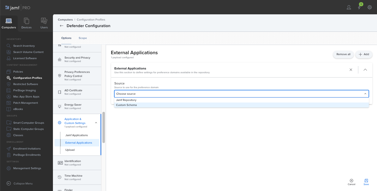 Scroll down to the Application & Custom Settings tab, select External Applications, select Add, and then use Custom Schema as the source for the preference domain.