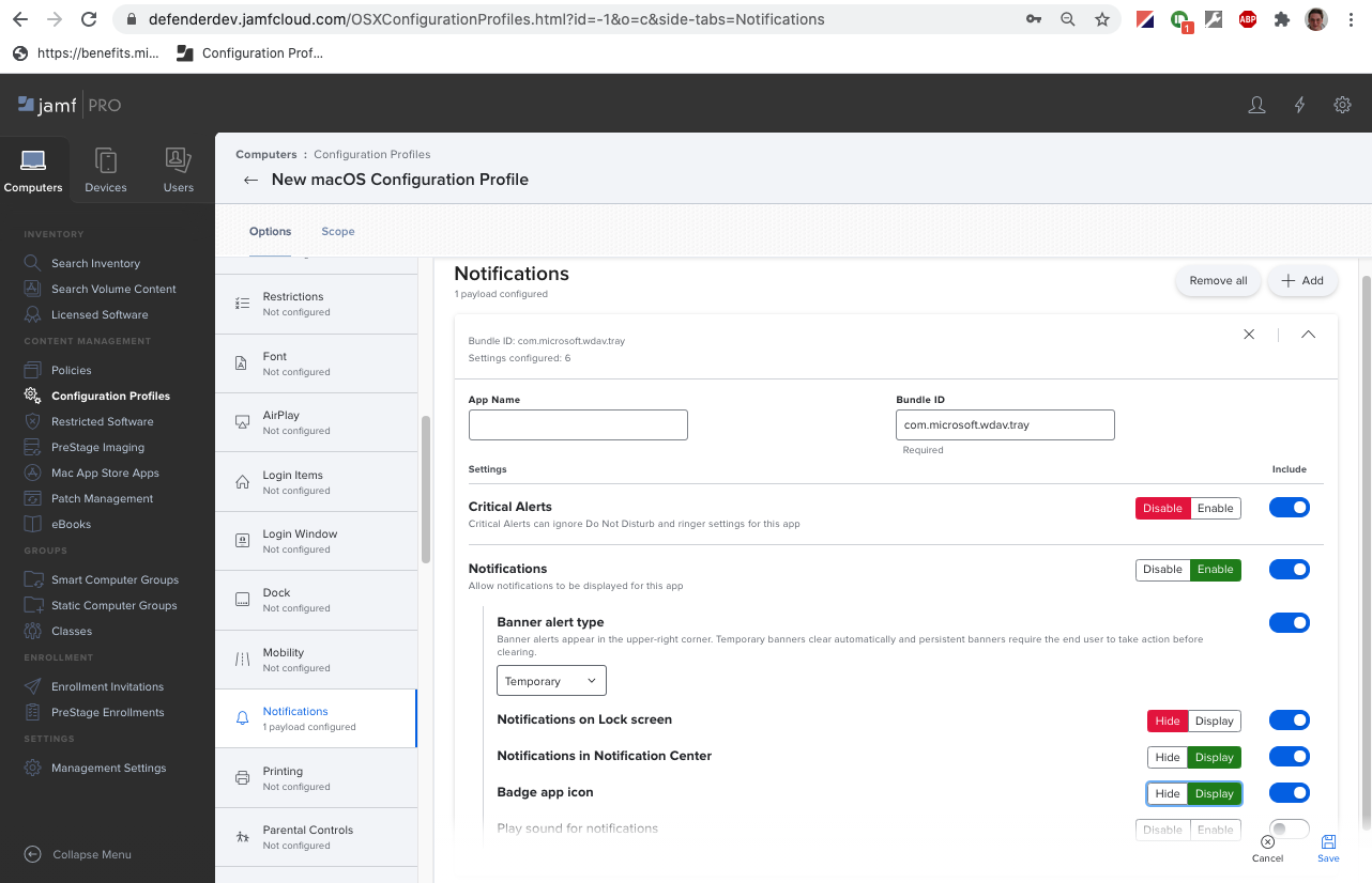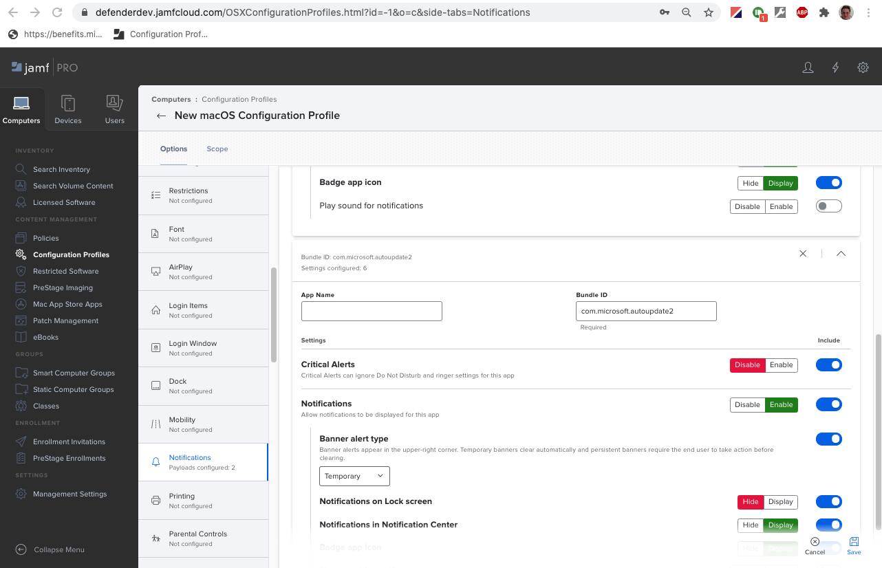 Now you have two tables with notification configurations, one for Bundle ID: com.microsoft.wdav.tray, and another for Bundle ID: com.microsoft.autoupdate.fba. While you can configure alert settings per your requirements, Bundle IDs must be exactly the same as described before, and Include switch must be On for Notifications.