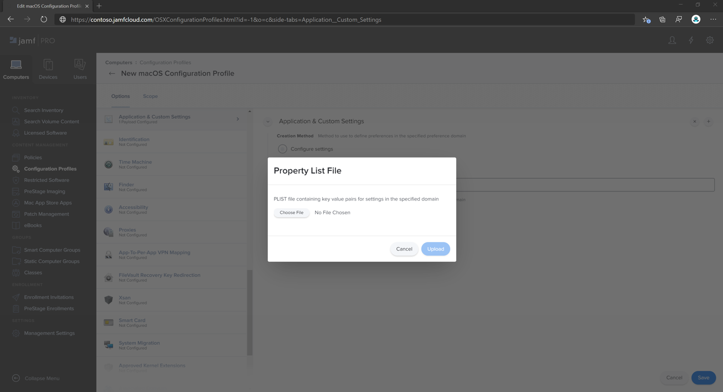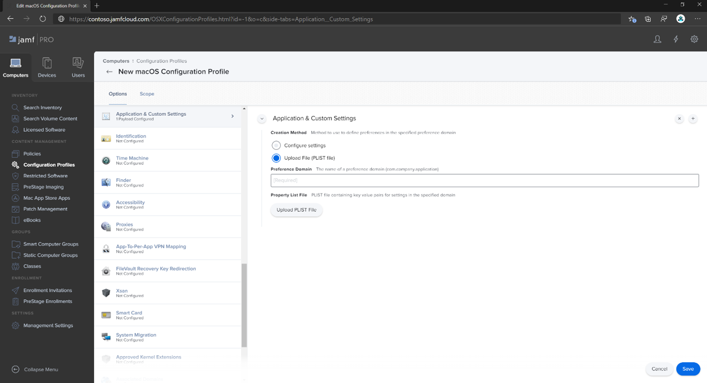 Upload downloaded mobileconfig to Jamf Configuration Profiles as described in Deploying Custom Configuration Profiles using Jamf Pro|Method 2: Upload a Configuration Profile to Jamf Pro.