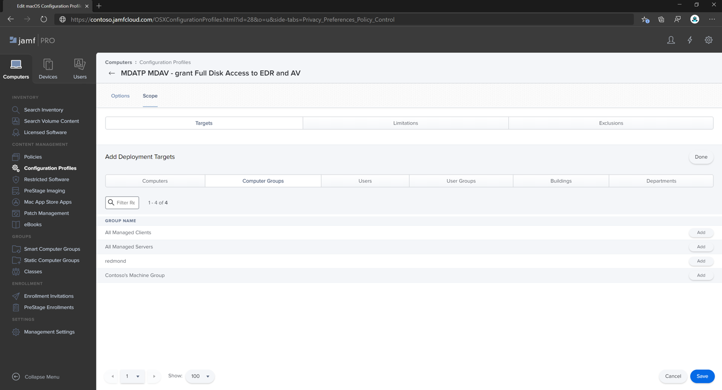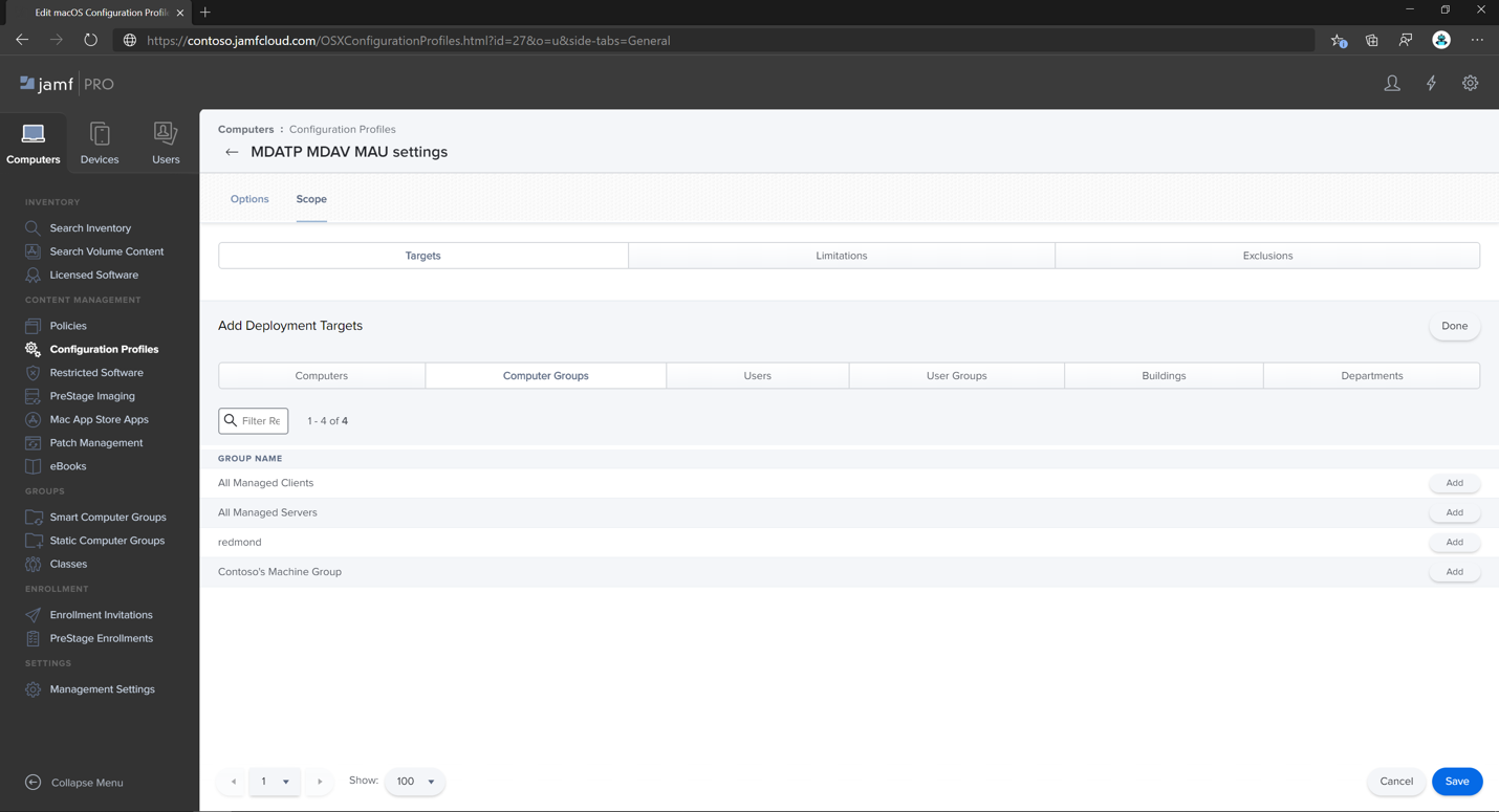 Select Contoso's Machine Group. Select Add, and then select Save.
