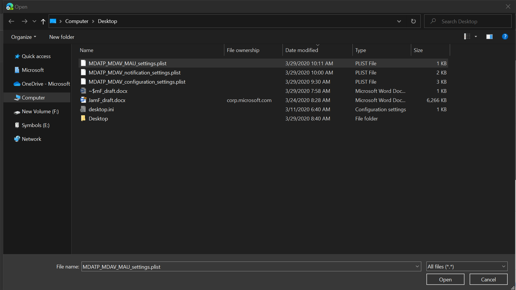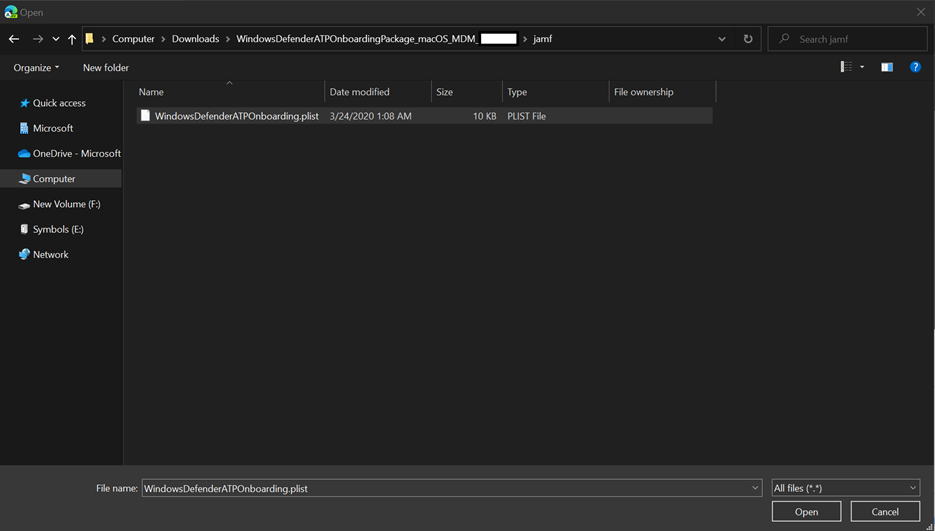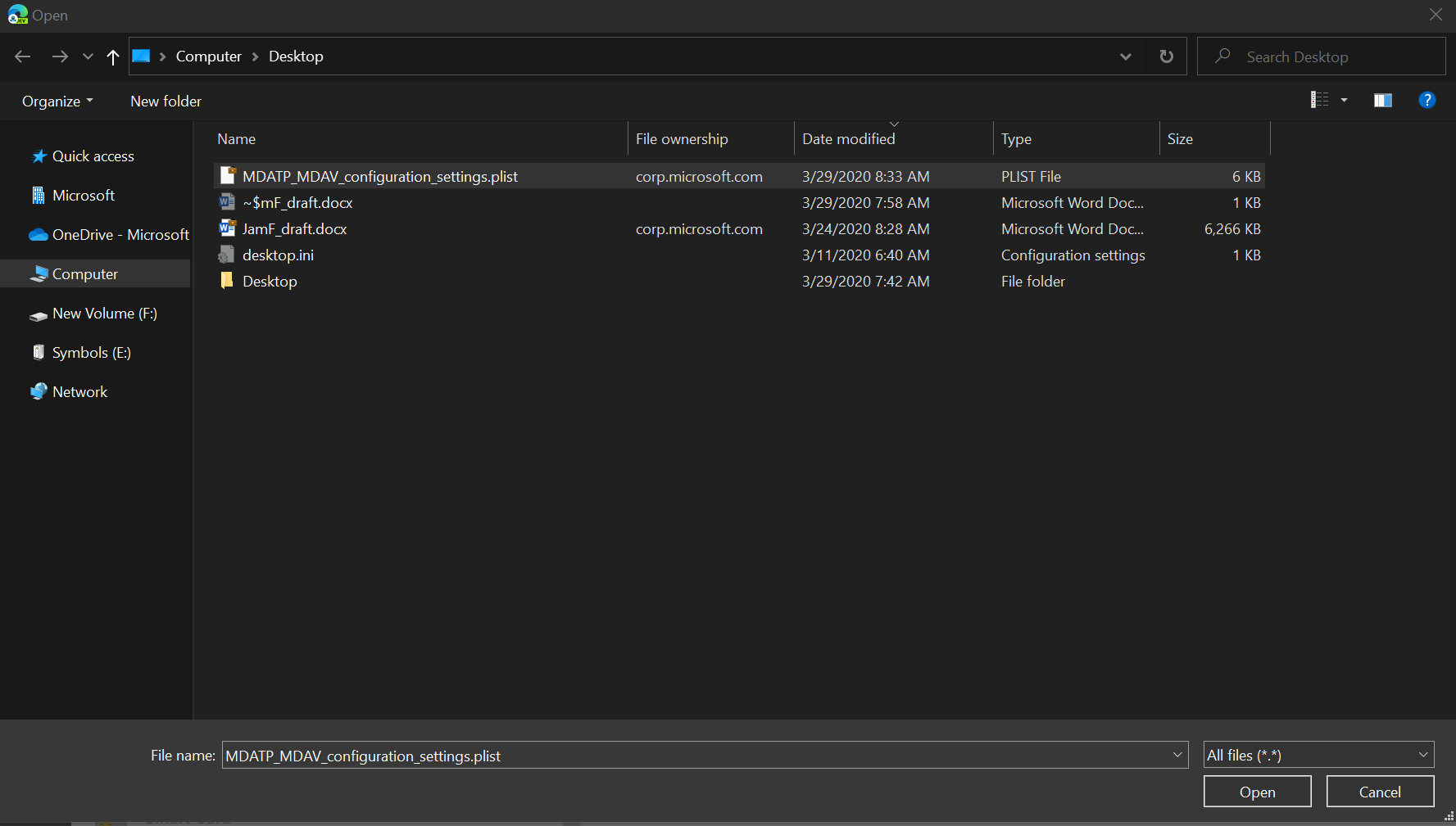 Select the MDATP_MDAV_configuration_settings.plist, and then select Open.