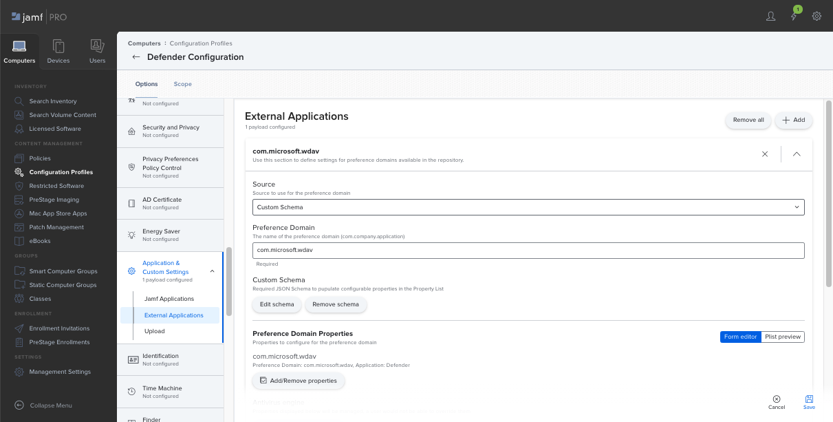 com.microsoft.wdavfor the Preference Domain, select Add Schema and then upload theschema.jsonfile downloaded on Step 1. Select Save.You can see all supported Microsoft Defender for Endpoint configuration settings under Preference Domain Properties. Select Add/Remove properties to select the settings that you want to be managed, and then select OK to save your changes. (Settings left unselected aren't included into the managed configuration, an end user can configure those settings on their machines.)