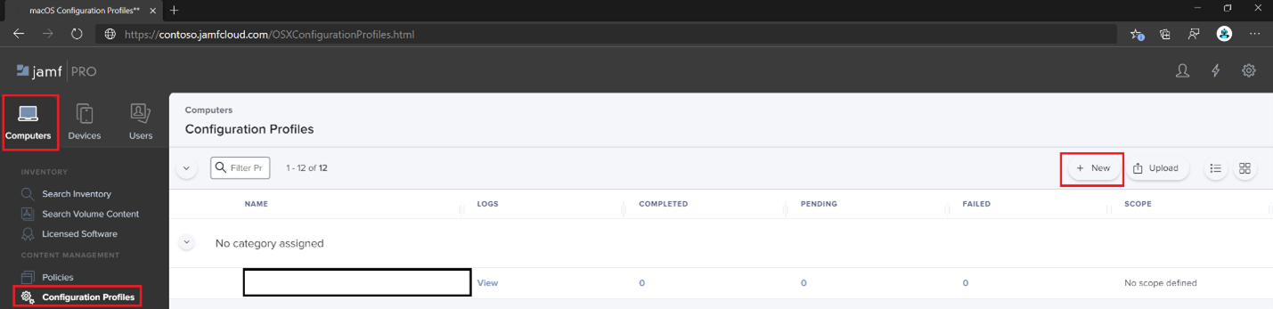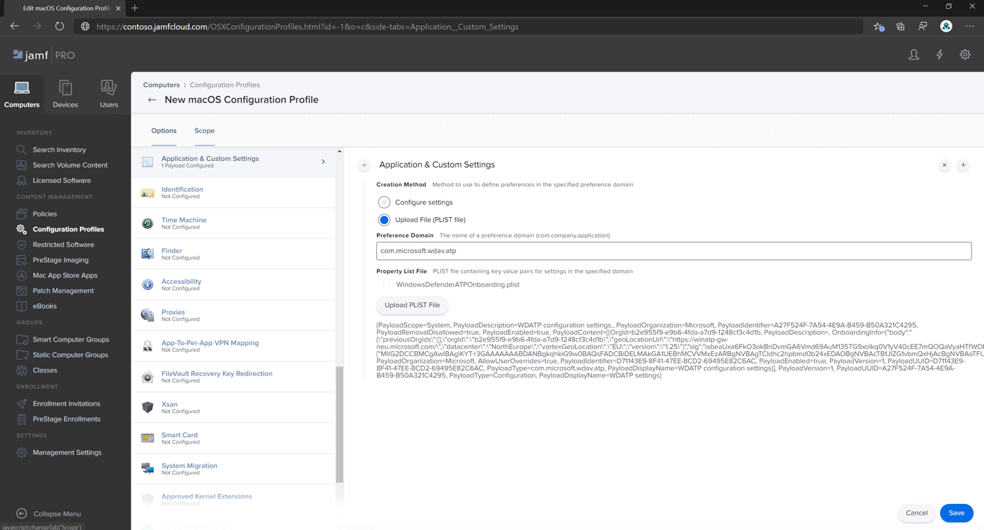 WindowsDefenderATPOnboarding.plistfrom the previous section.Sign in to Jamf Pro, navigate to Computers > Configuration Profiles, and select New.