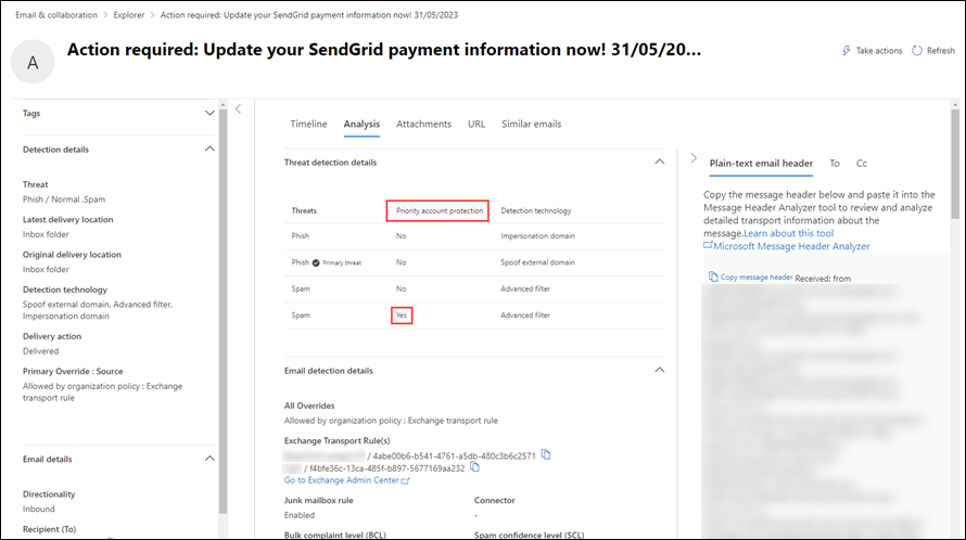 On the Email entity page, select the Analysis tab. Priority account protection is listed in the Threat detection details section.