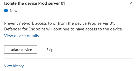 | Isolate device | Isolates a device, which helps prevent an attacker from controlling it and performing further activities such as data exfiltration and lateral movement. The isolated device will still be connected to Microsoft Defender for Endpoint. |