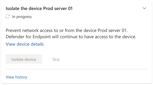For cards with one-click response actions, select the required action. The Action status in the card changes to In progress, then to Failed or Completed, depending on the action's outcome.