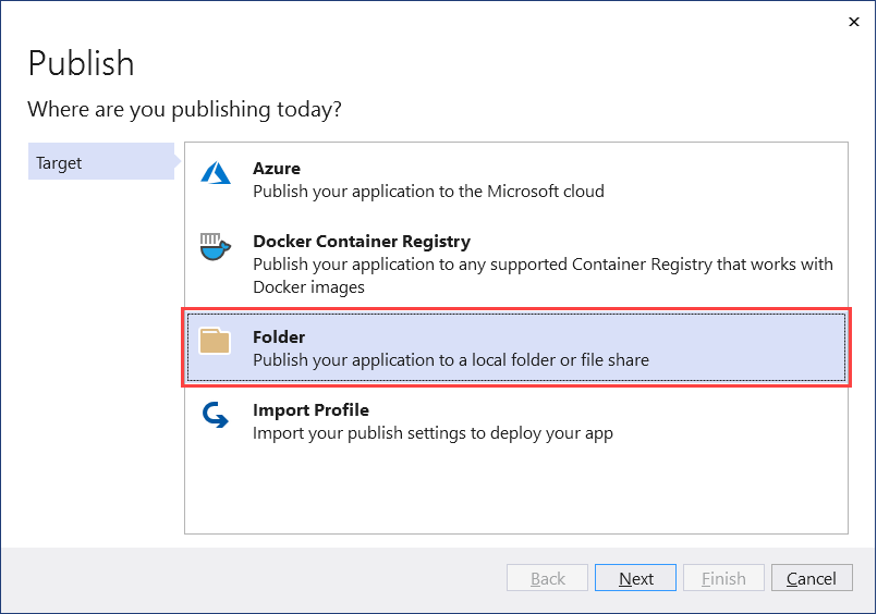 Right-click on the project in the Solution Explorer, and select Publish. Then, select Add a publish profile to create a profile. From the Publish dialog, select Folder as your Target.