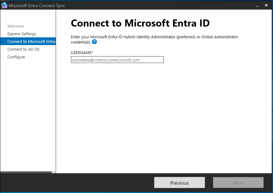 - In Connect to Microsoft Entra ID, enter the username and password of the Hybrid Identity Administrator account, and then select Next.