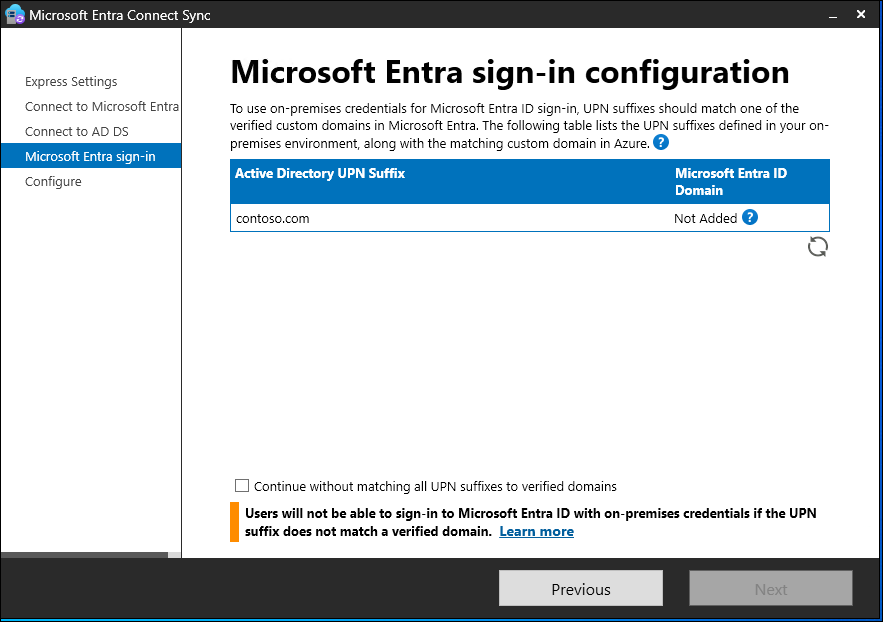- The Microsoft Entra ID sign-in configuration page appears only if you didn't complete the step to verify your domains in the prerequisites.