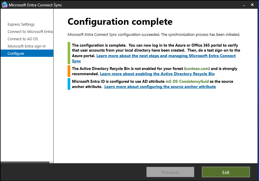 If you leave the Start the synchronization process when configuration completes checkbox selected, a full sync of all users, groups, and contacts to Microsoft Entra ID begins immediately.
