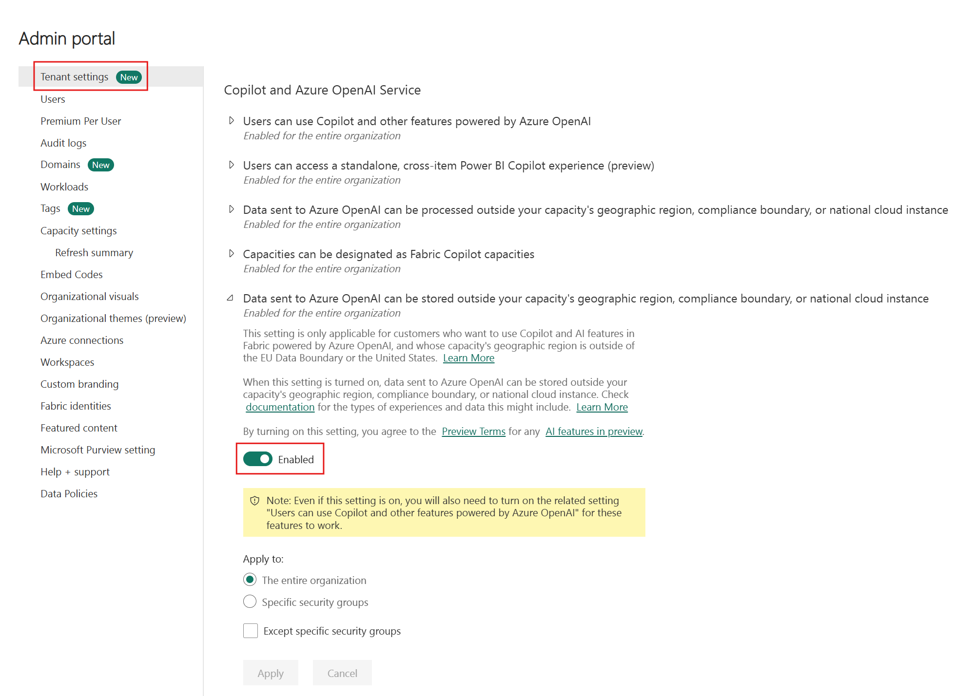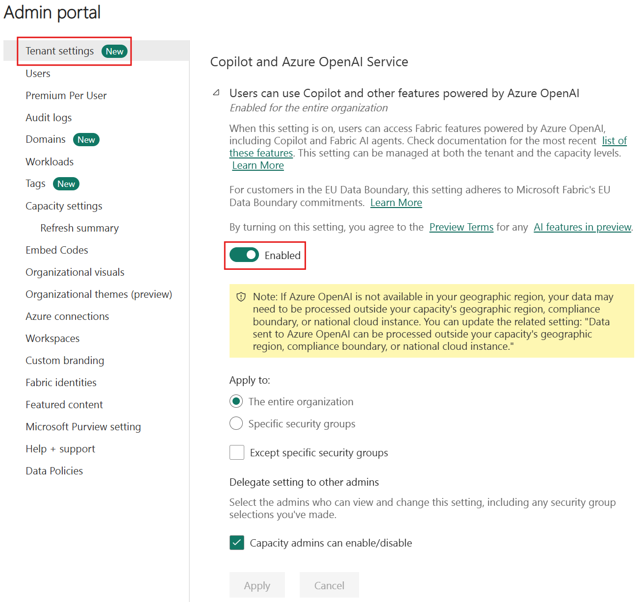 This setting is only applicable for customers who want to use Copilot and AI features in Fabric powered by Azure OpenAI, and whose capacity's geographic region is outside of the EU data boundary and the US. When this setting is enabled, service background jobs may execute across geographic boundaries at no charge to the tenant capacity to support end user experiences.