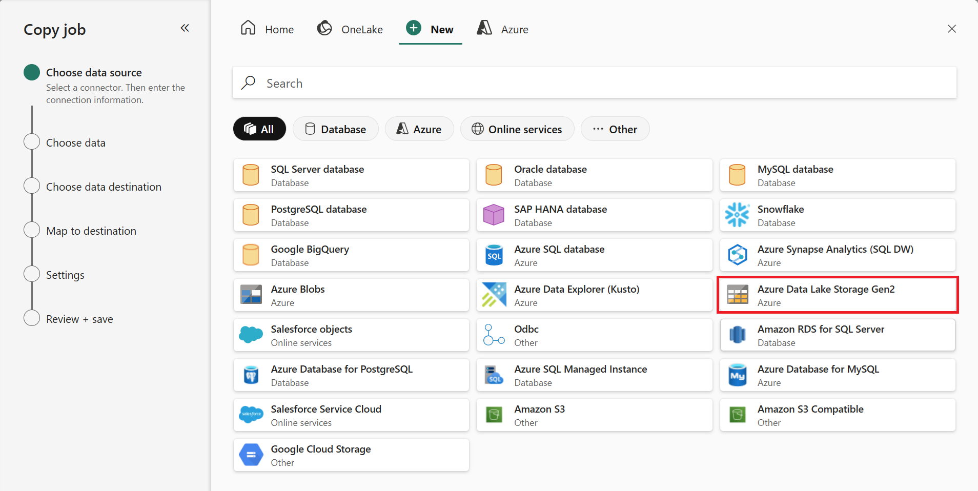 Choose the data stores to copy data from. In this example, we used Azure Data Lake Storage Gen2.