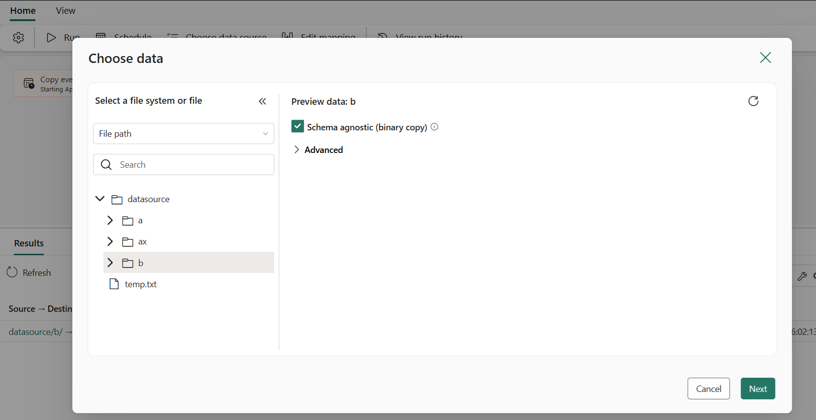 Choose a copy mode: Full data copy or Incremental copy. In this example, we use Incremental copy so that the Copy job will copy all files on the first run, and then copy only new or updated files in the next runs.