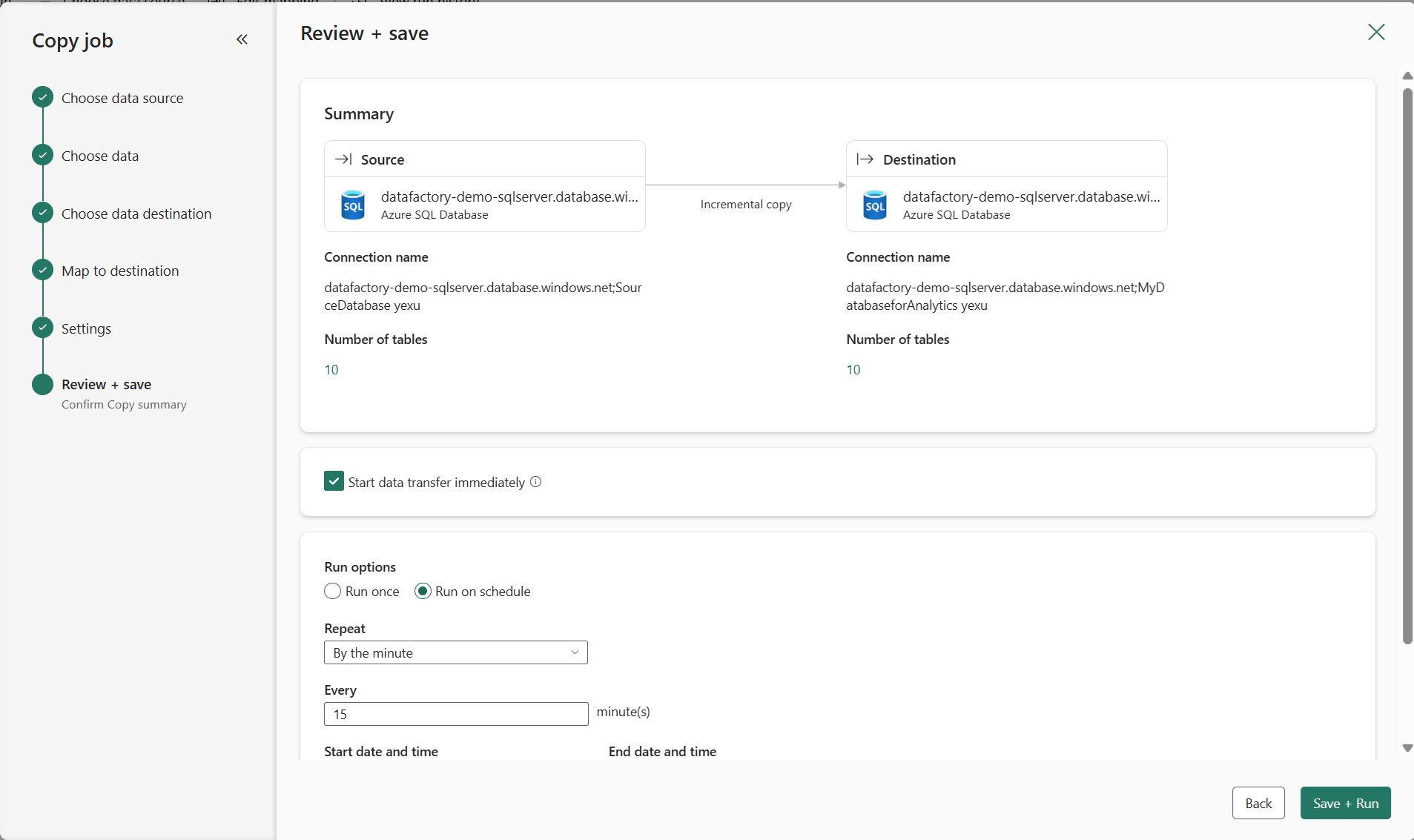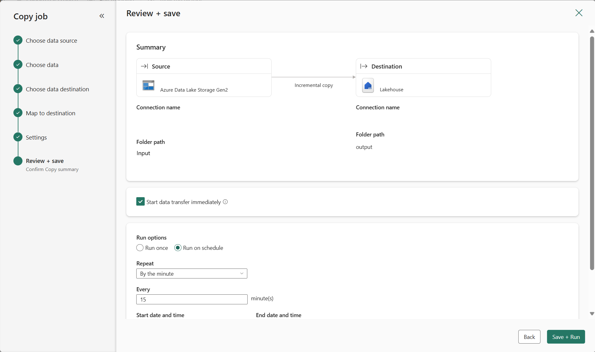 Review the job summary, select your run option to run once or on a schedule, and select Save + Run.