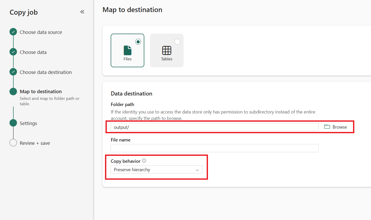 Select the Folder path in your destination storage. Choose Preserve Hierarchy to maintain the same folder structure as the source, or Flatten Hierarchy to place all files in a single folder.