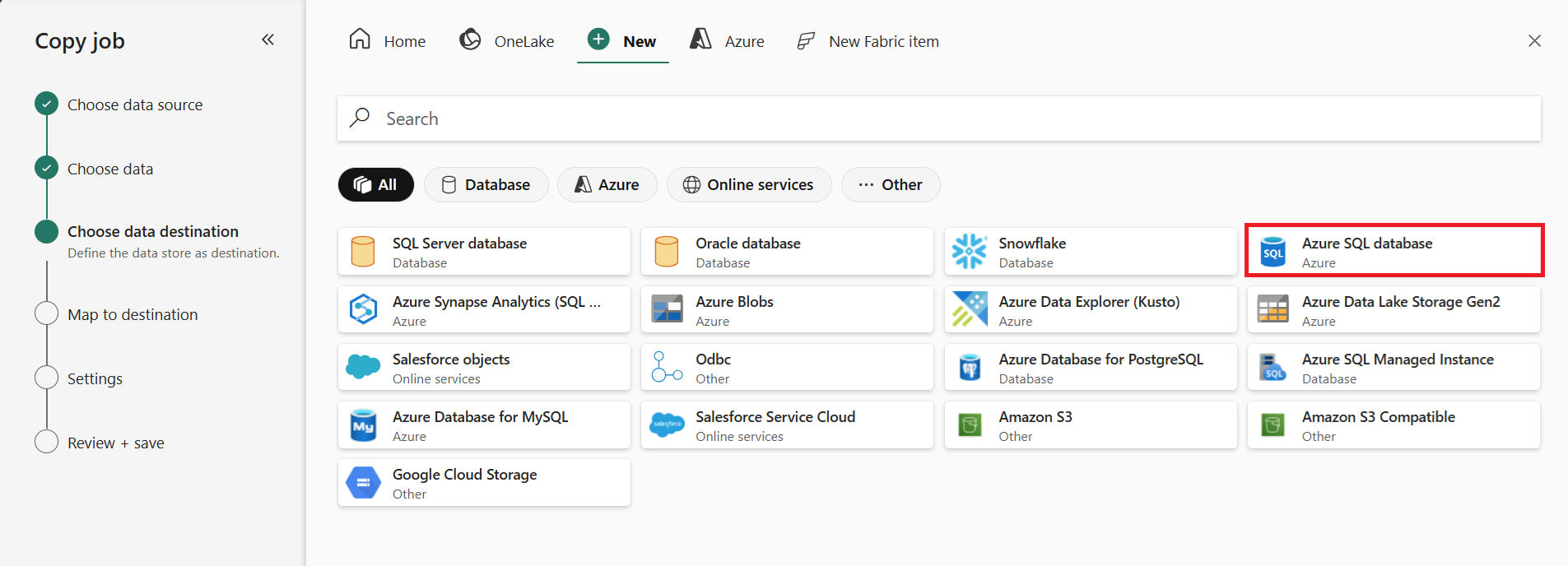 Select your destination store. In this example, we're using another Azure SQL DB.
