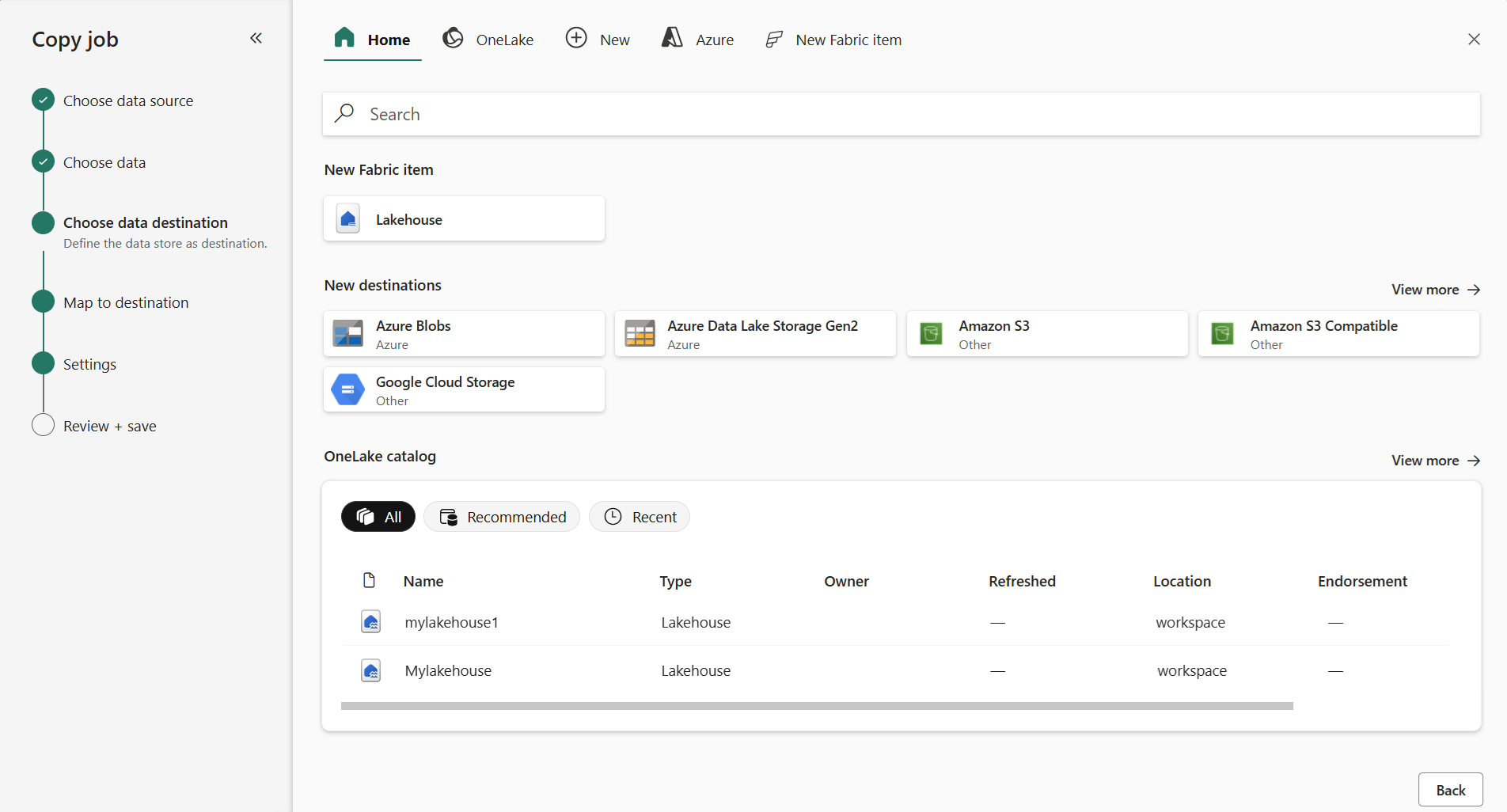 Select your destination store. In this example, we chose Lakehouse.