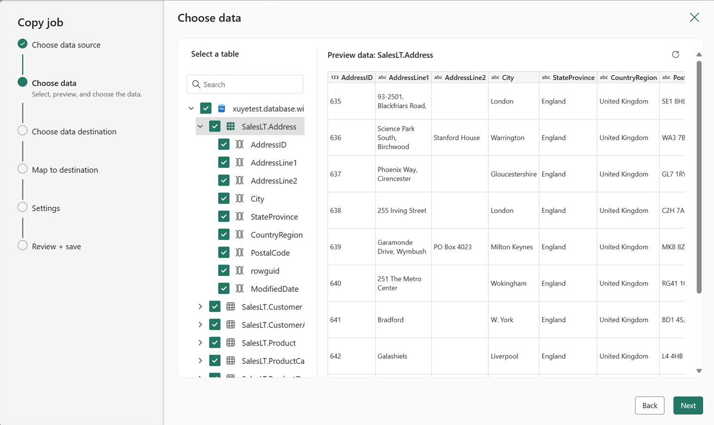 Select the tables and columns to copy, or use a database query to copy subsets of your data. Use the search box to identify full tables and columns you want to copy, or select + New query under Queries to write a custom query.
