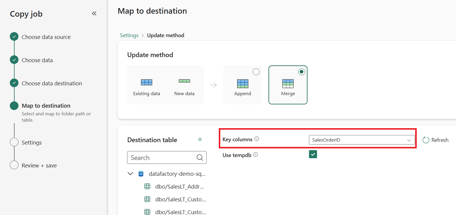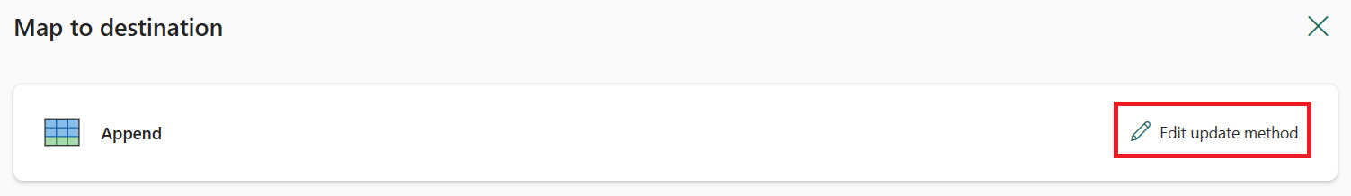 (Optional) Choose Update method to decide how data gets written to your destination. If you pick Merge, select the Key columns that identify each row.