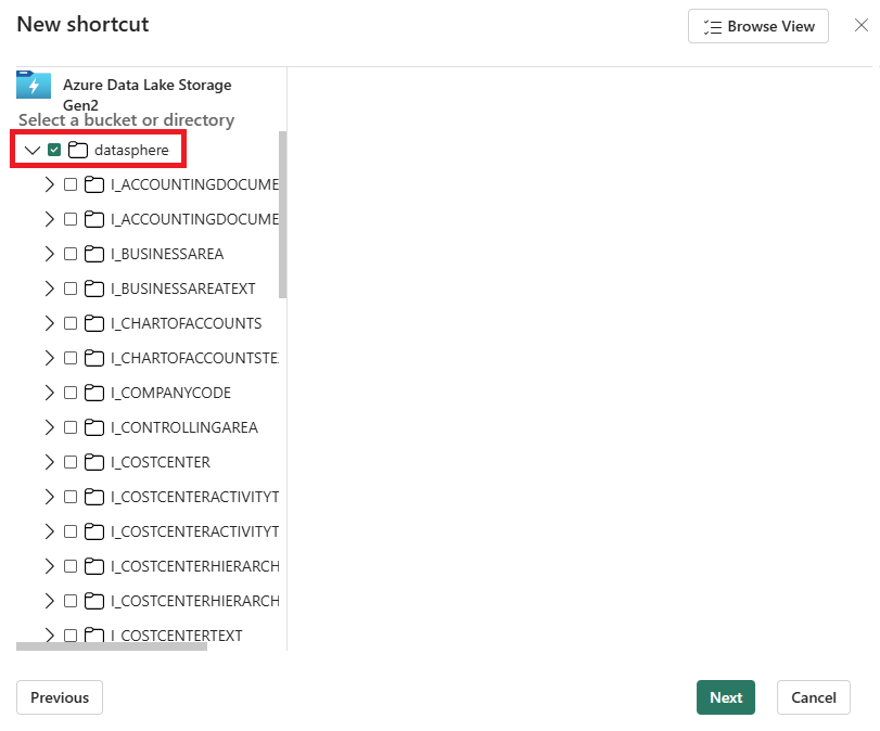 In your lakehouse, create an Azure Data Lake Storage Gen2 shortcut to the storage container where SAP Datasphere replicates the source SAP data. Make sure you select the whole storage container when creating the shortcut: