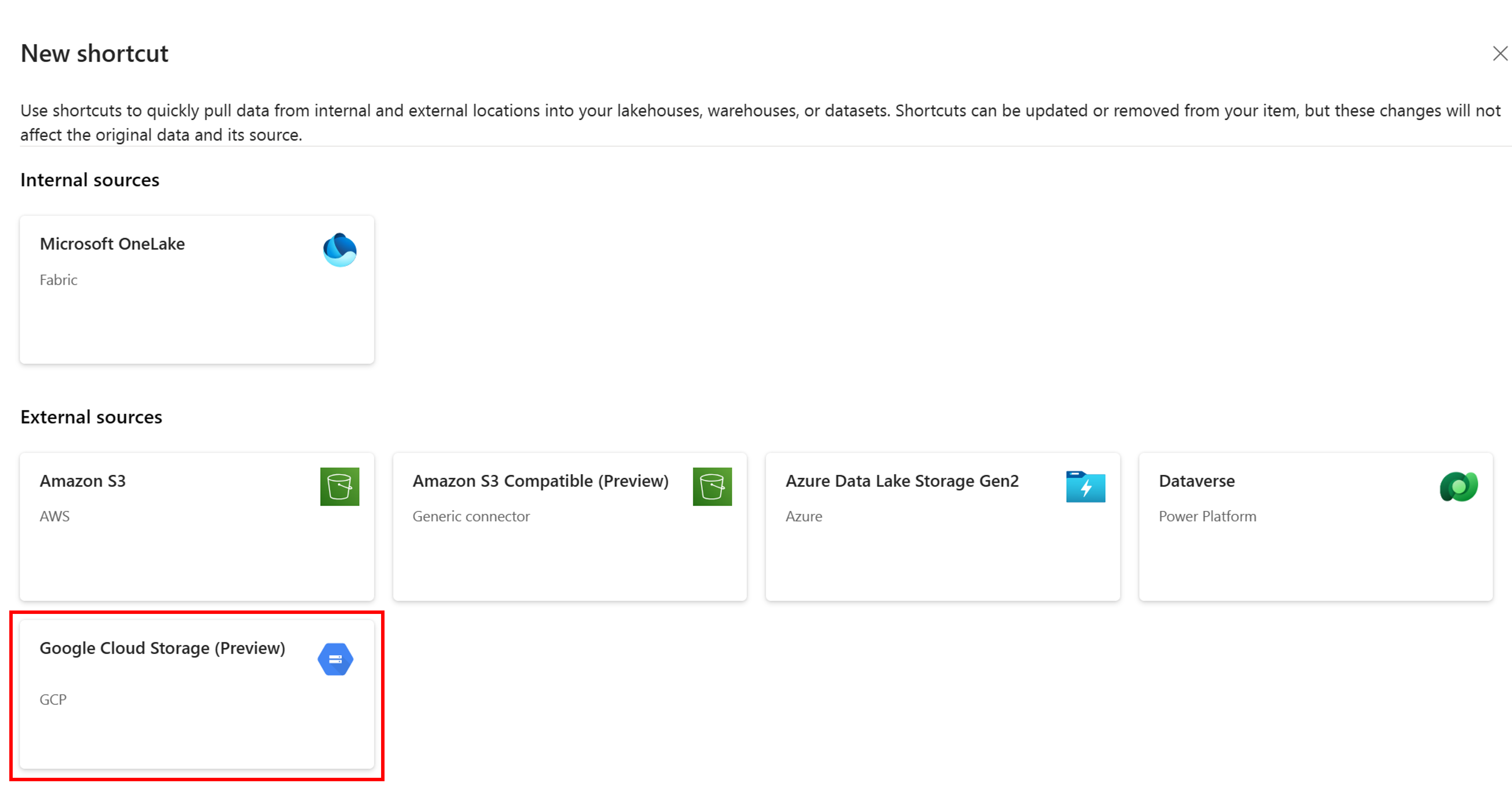 In this article, you learn how to create a Google Cloud Storage (GCS) shortcut inside a Fabric lakehouse. Shortcuts can be created to Google Cloud Storage(GCS) using the XML API for GCS. When you create shortcuts to Google Cloud Storage, the target path must contain a bucket name at a minimum. You can also restrict the scope of the shortcut by further specifying the prefix/folder you want to point to within the storage hierarchy.