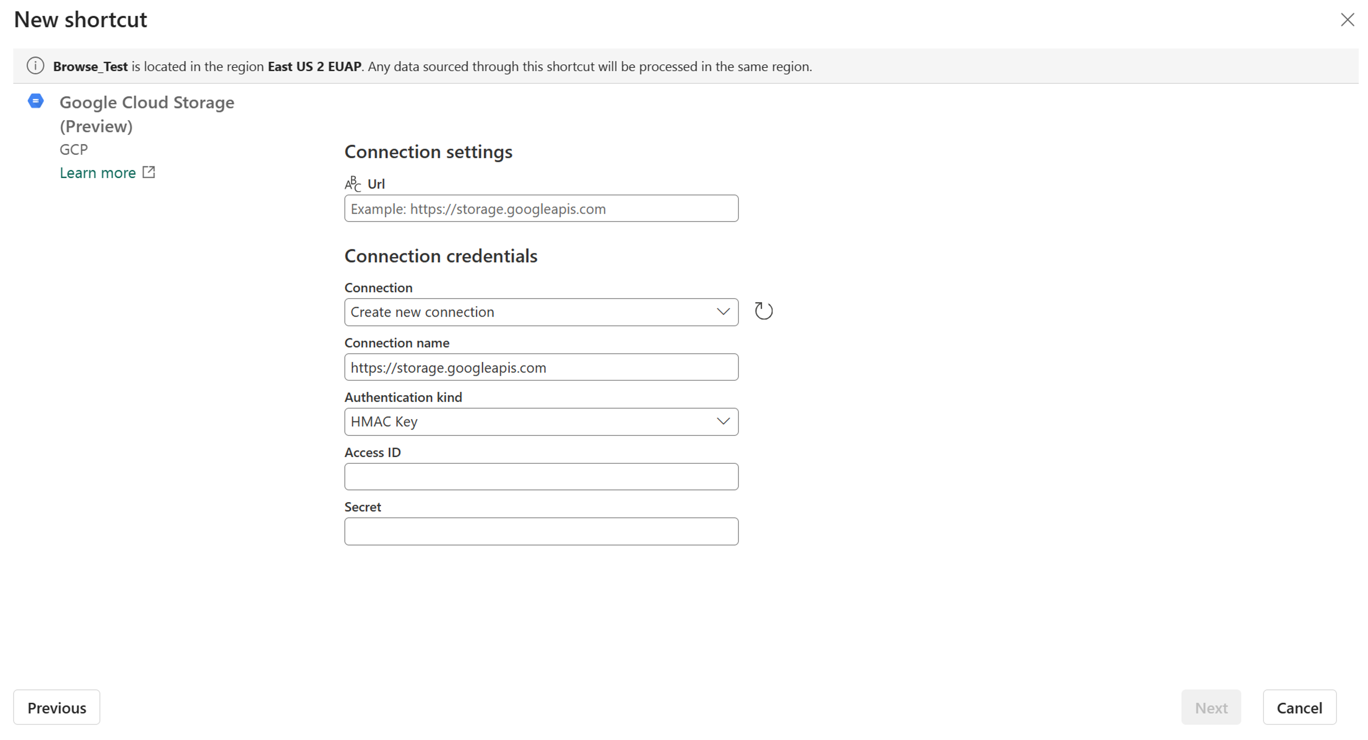 Field Description Value URL The connection string for your GCS bucket. The bucket name is optional. https://BucketName.storage.googleapis.comhttps://storage.googleapis.comConnection Previously defined connections for the specified storage location appear in the drop-down. If no connections exist, create a new connection. Create new connection Connection name The user defined name for the connection. A name for your connection. Authentication kind Fabric uses Hash-based Message Authentication Code (HMAC) keys to access Google Cloud storage. These keys are associated with a user or service account. The account must have permission to access the data within the GCS bucket. If the bucket specific endpoint was used in the connection URL, the account must have the storage.objects.getandstorage.objects.listpermissions. If the global endpoint was used in the connection URL, the account must also have thestorage.buckets.listpermission.HMAC Key Access ID The access key associated with a user or service account. For more on creating HMAC keys, see Manage HMAC Keys. Your access key. Secret The secret for the access key. Your secret key. Select Next.