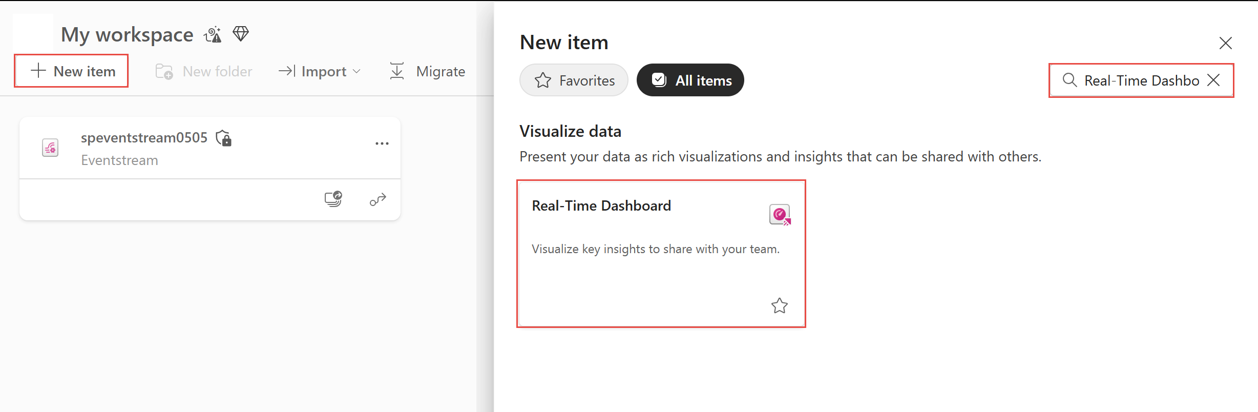 In the New item window, select Real-Time Dashboard. Search using the text box if needed.