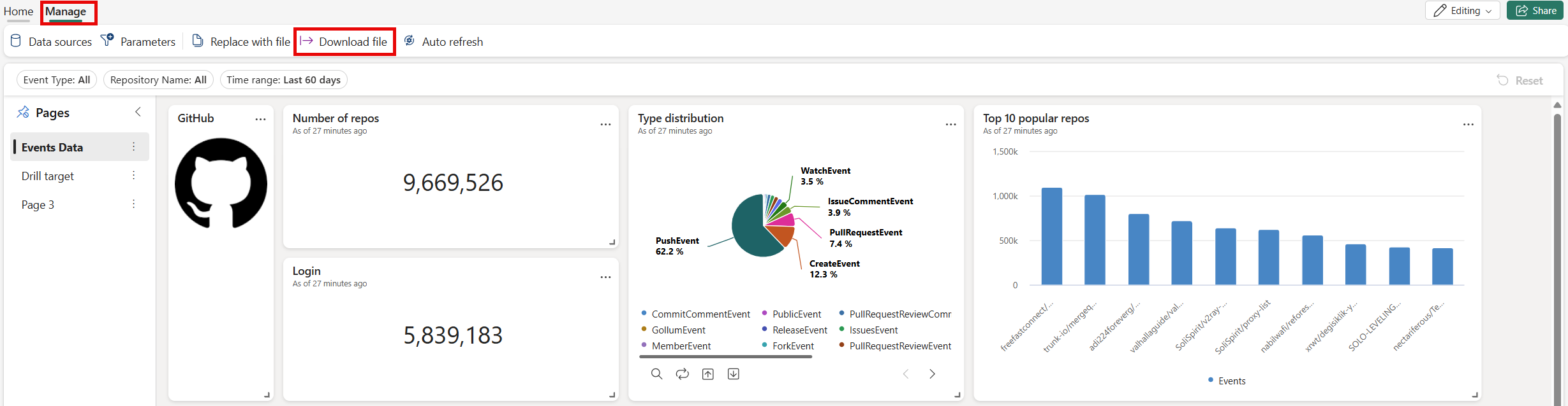 To export a dashboard, in the dashboard, select the Manage tab > |-> Download file.