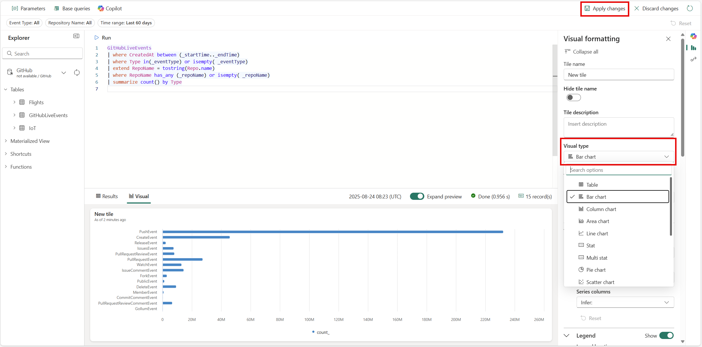 In the Visual formatting tab, select Visual type to choose the type of visual. For more information on how to customize the visual, see Customize Real-Time Dashboard visuals.