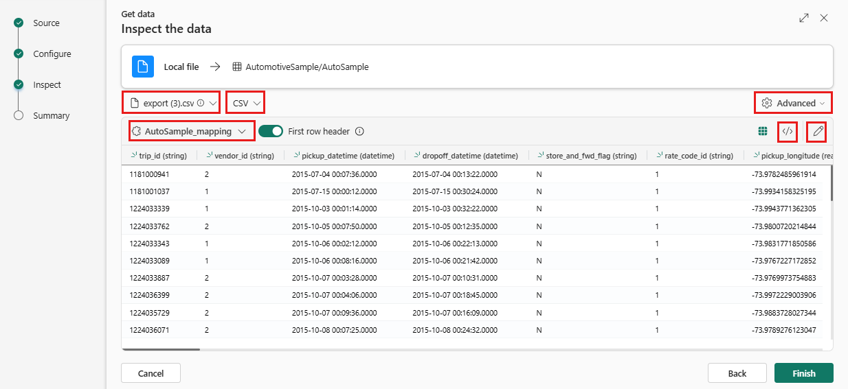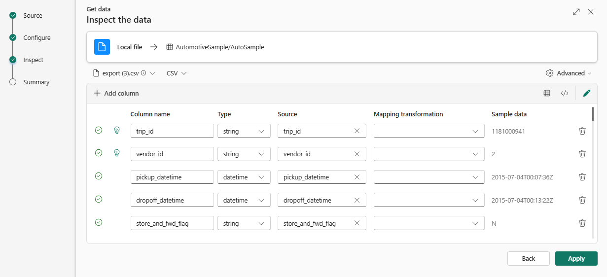 If you're ingesting tabular formats in an existing table, you can select Advanced > Keep table schema. Tabular data doesn't necessarily include the column names that are used to map source data to the existing columns. When this option is checked, mapping is done by-order, and the table schema remains the same. If this option is unchecked, new columns are created for incoming data, regardless of data structure.
