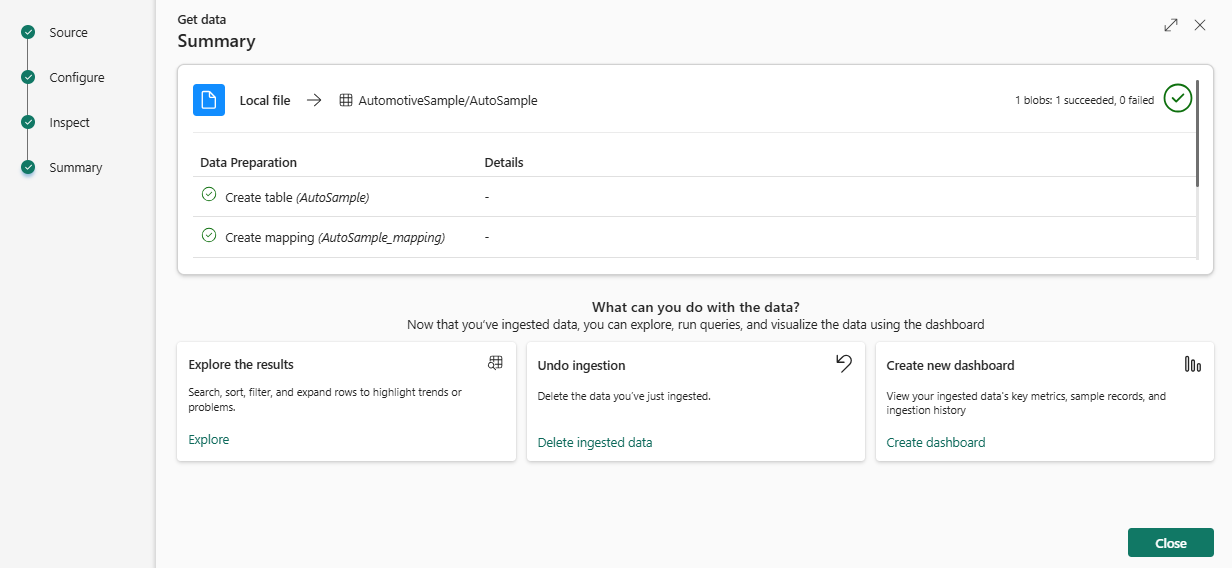 In the Data preparation window, all three steps are marked with green check marks when data ingestion finishes successfully. You can select a card to query, drop the ingested data, or see a dashboard of your ingestion summary.