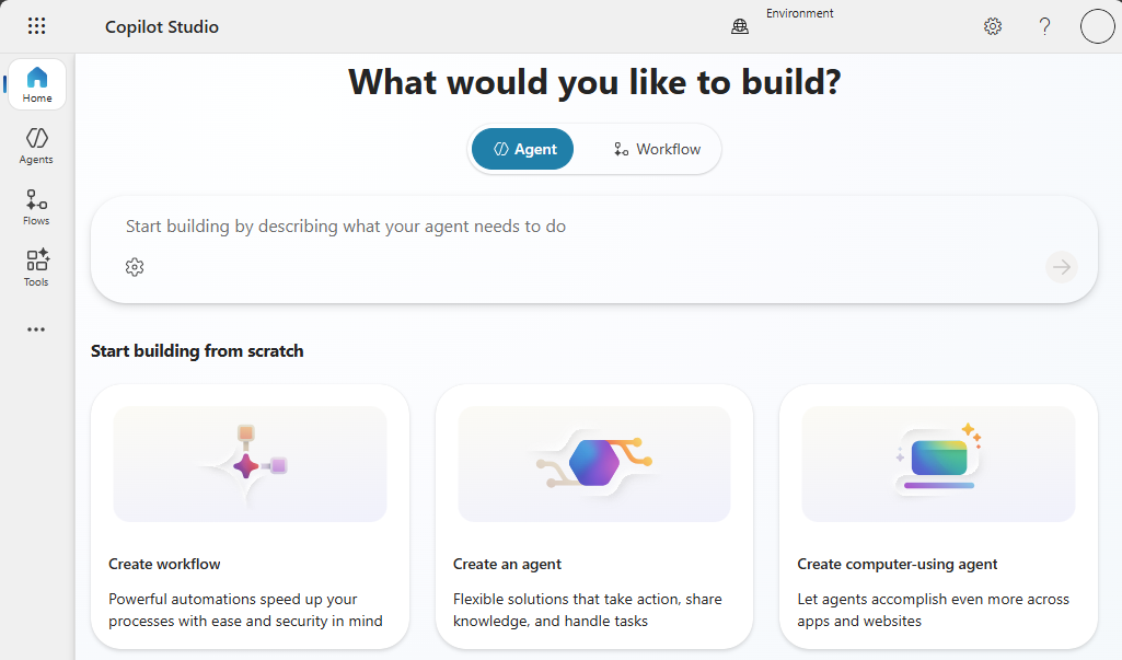 If you don't see the box prompting you to describe what your agent needs to do, your environment doesn't support agent creation by using natural language. For more options, see Create an agent.
