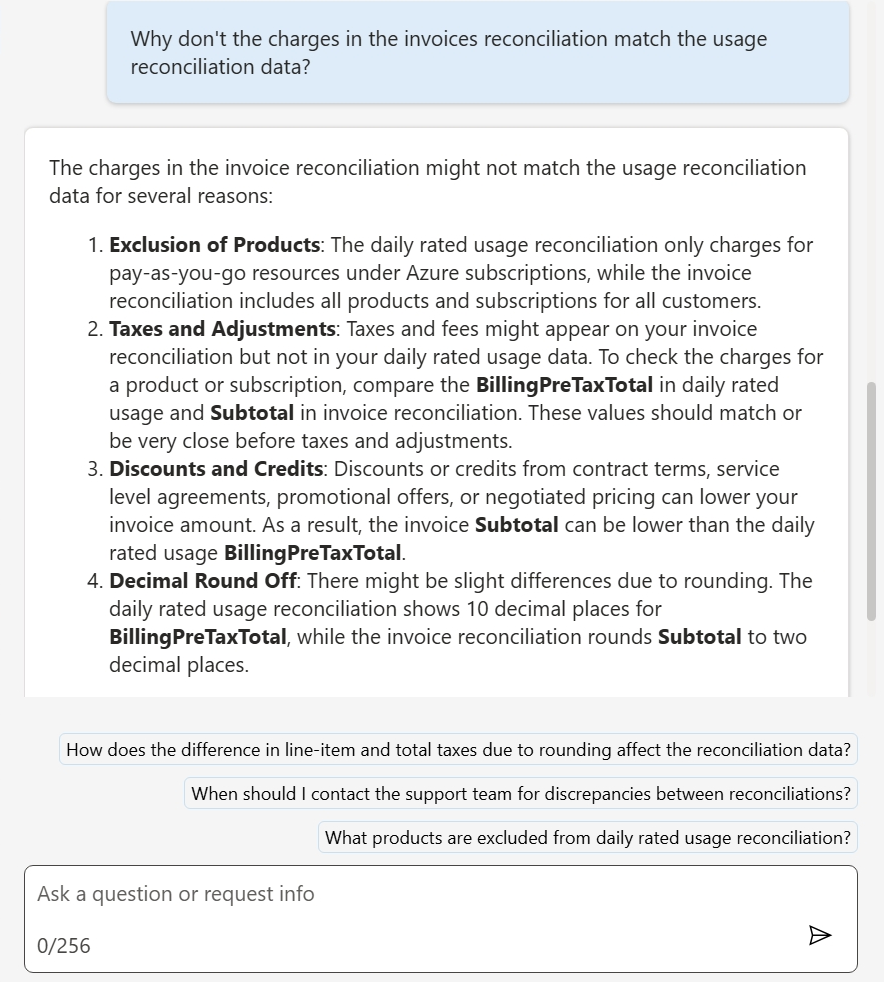 - Frequently asked questions: AI assistant answers the most frequently asked questions about using the Billing workspace. Examples include: reconciliation basics, attribute definitions for the data on the Billing pages and downloads, and any by-design data scenarios.