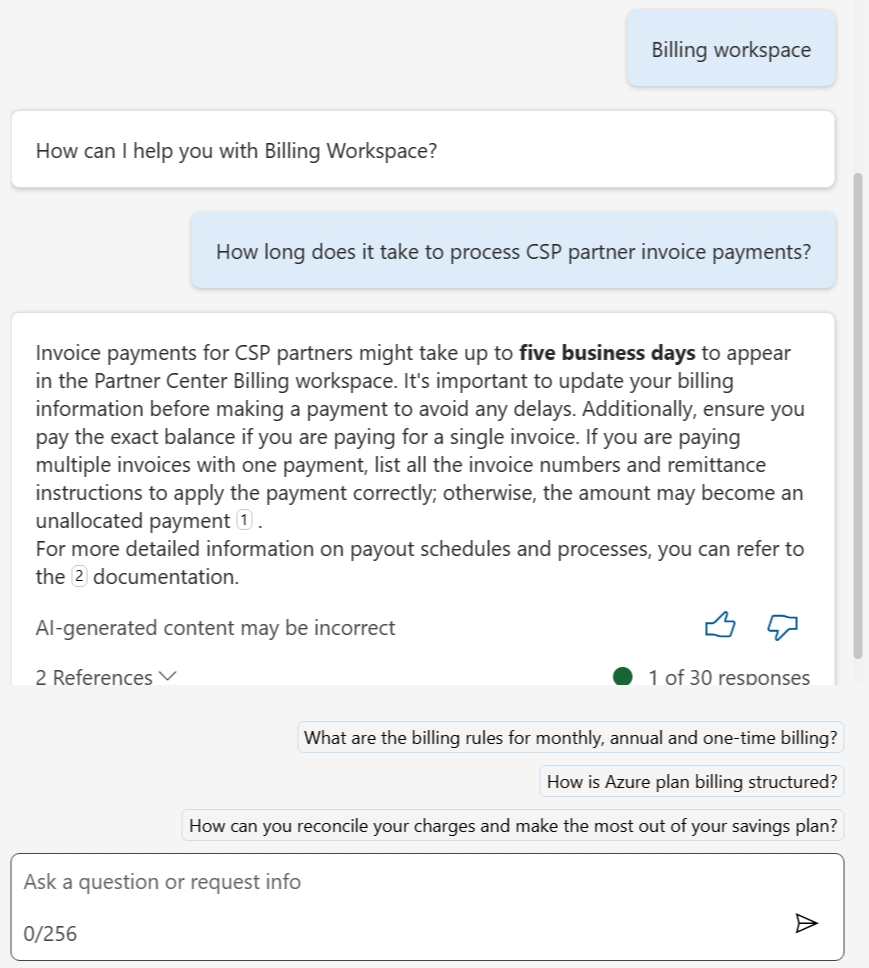 Partner Center AI assistant (preview) can answer your questions about the Billing workspace. AI assistant answers frequently asked questions and can help you with Azure spending budget.