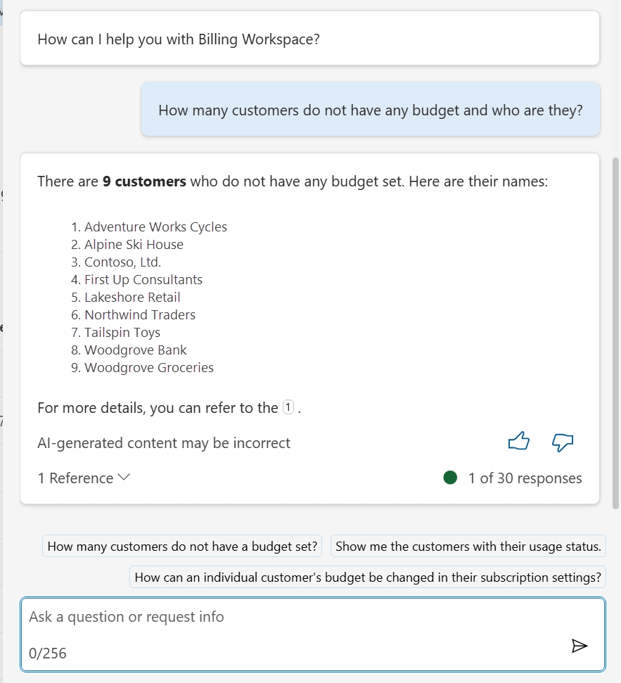 Here are a few examples of the kinds of prompts you can use in the Billing workspace. Modify these prompts based on your scenarios, or try other prompts to get different kinds of information.