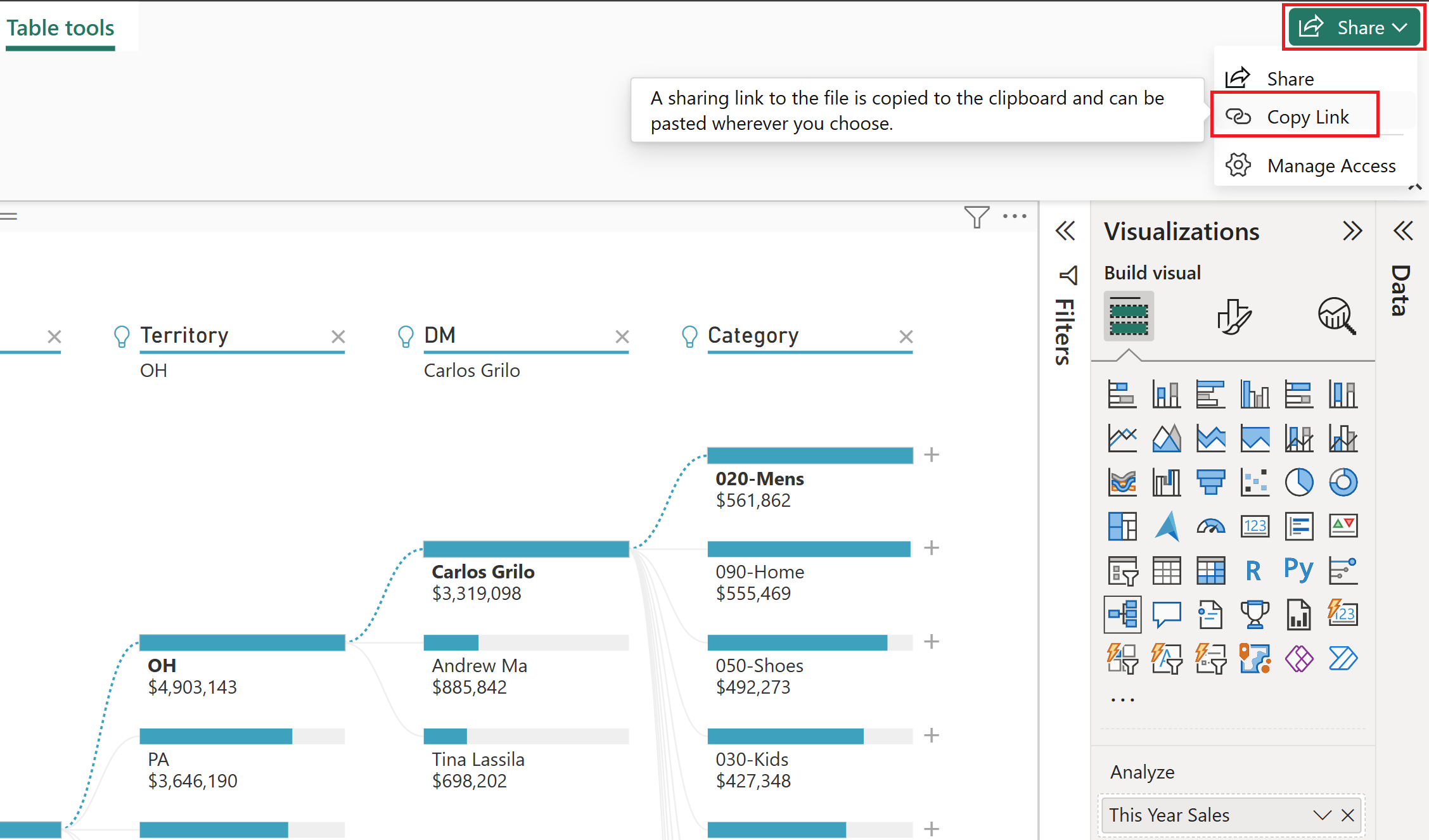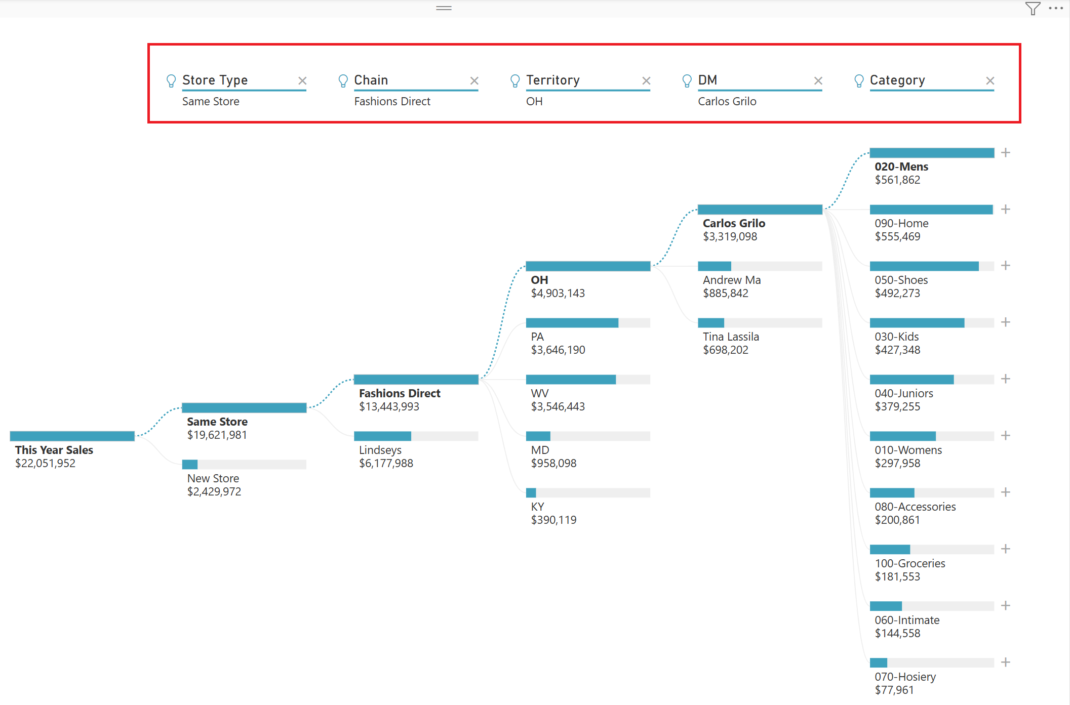 Now anyone who views your report can interact with the decomposition tree, starting from the first This Year Sales and choosing their own path to follow.