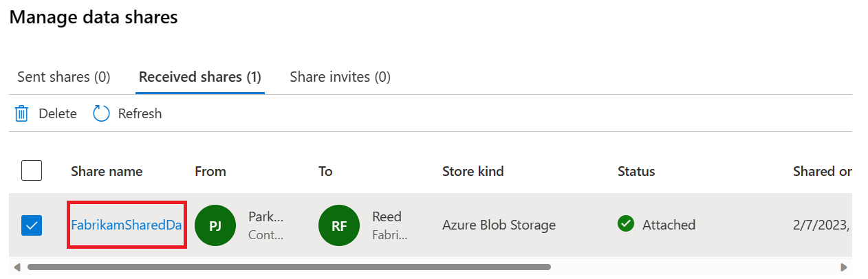 Once you attach a share, you can edit the received share by reattaching the share to a new storage account, or stop the sharing relationship by deleting the received share.