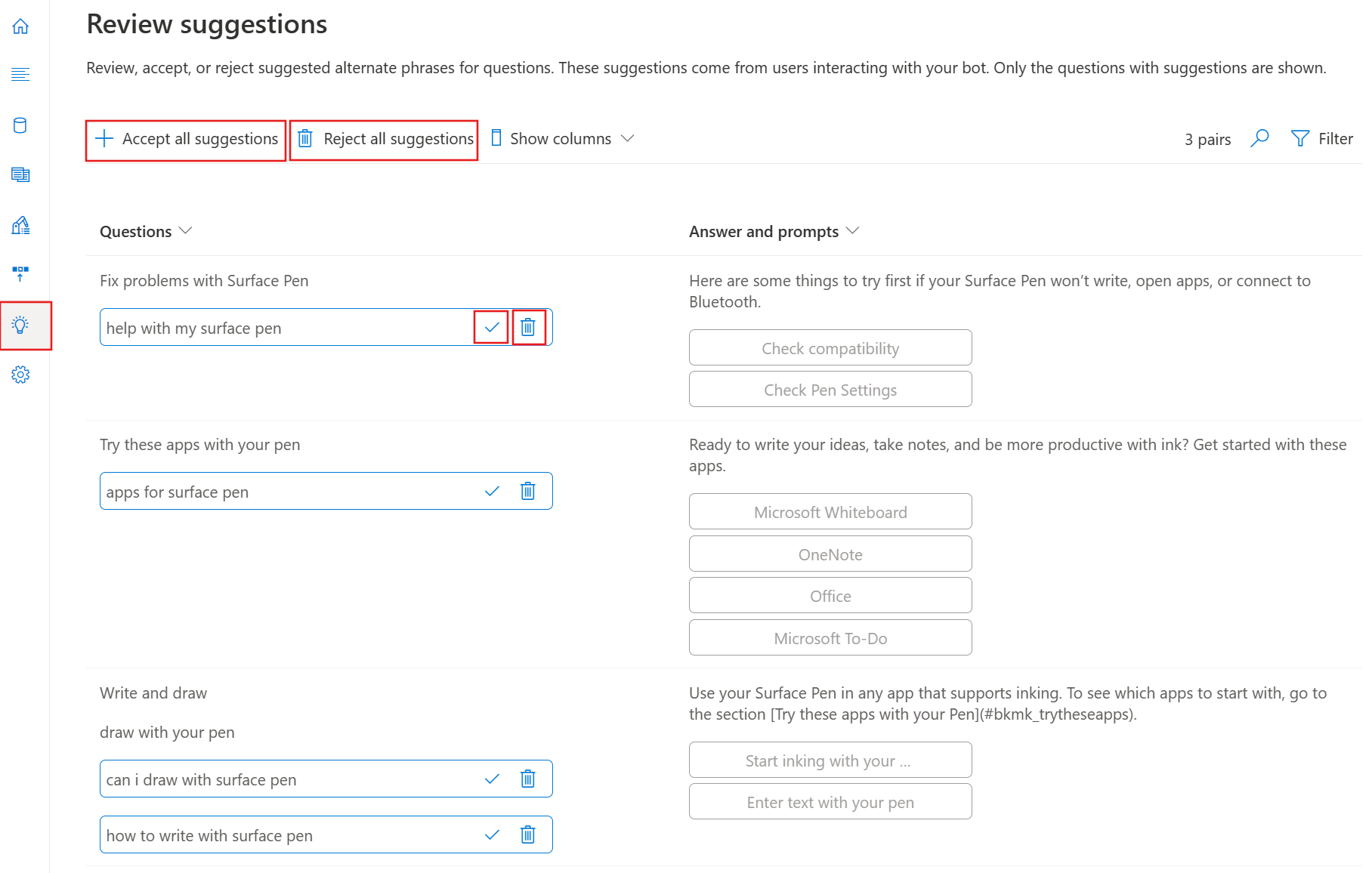 You review, and then accept or reject these alternate phrases suggested for each question by selecting the checkmark or delete symbol next to the alternate phrase. You can bulk accept or reject suggestions using the Accept all suggestions or Reject all suggestions option at the top.