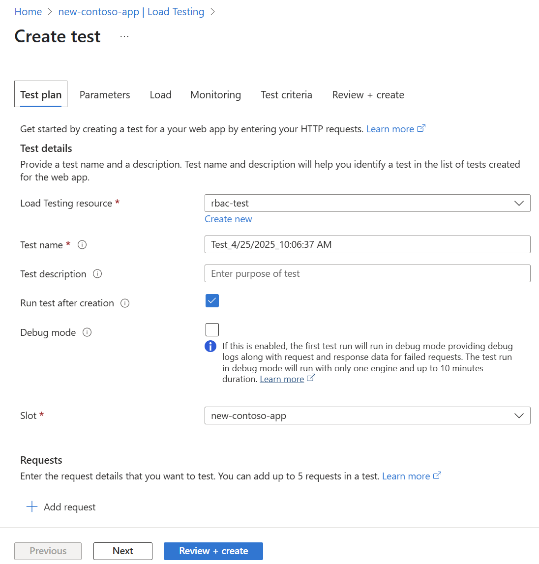 Field Description Load Testing Resource Select your load testing resource. Create new if you don't have one in the Azure subscription. Test name Enter a unique test name. Test description (Optional) Enter a load test description. Run test after creation When selected, the load test starts automatically after creating the test. If you have multiple deployment slots for the web app, select the Slot against which to run the load test.