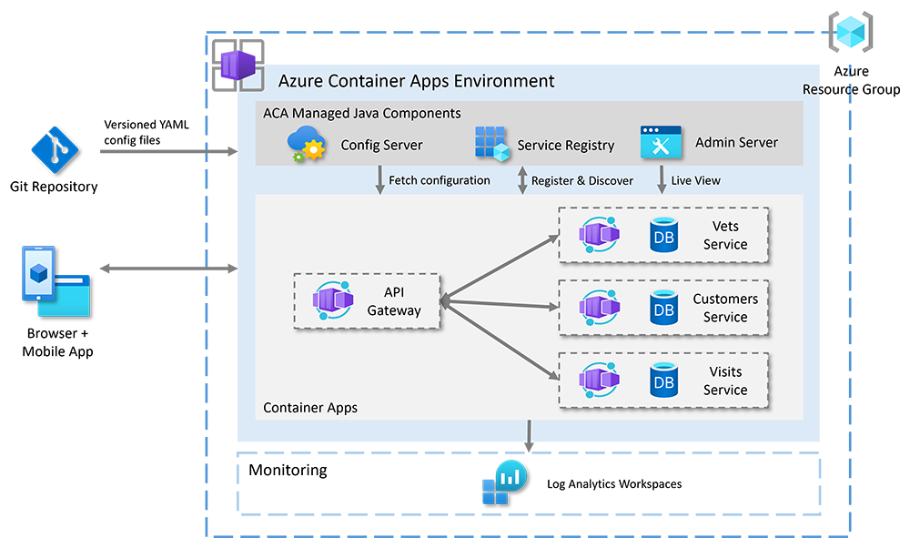 In this quickstart, you learn how to deploy an application in Azure Container Apps that uses Java components to handle configuration management, service discovery, and health and metrics. The sample application used in this example is the Java PetClinic, which uses the microservice architecture pattern. The following diagram depicts the architecture of the PetClinic application on Azure Container Apps: