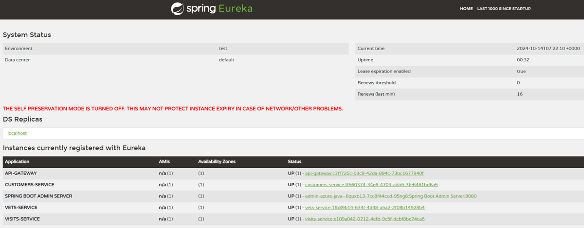 az containerapp env java-component eureka-server-for-spring show \ --resource-group $RESOURCE_GROUP \ --name $EUREKA_SERVER_COMPONENT \ --environment $CONTAINER_APP_ENVIRONMENT \ --query properties.ingress.fqdnOpen the URL in your browser. You should see an application that resembles the following screenshot: