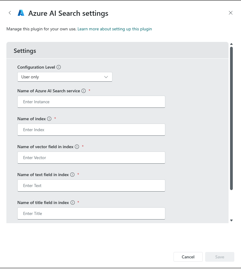 To use the Azure AI Search plugin in Copilot, make sure that the Azure AI Search index that you would like to connect to Copilot is configured as follows: