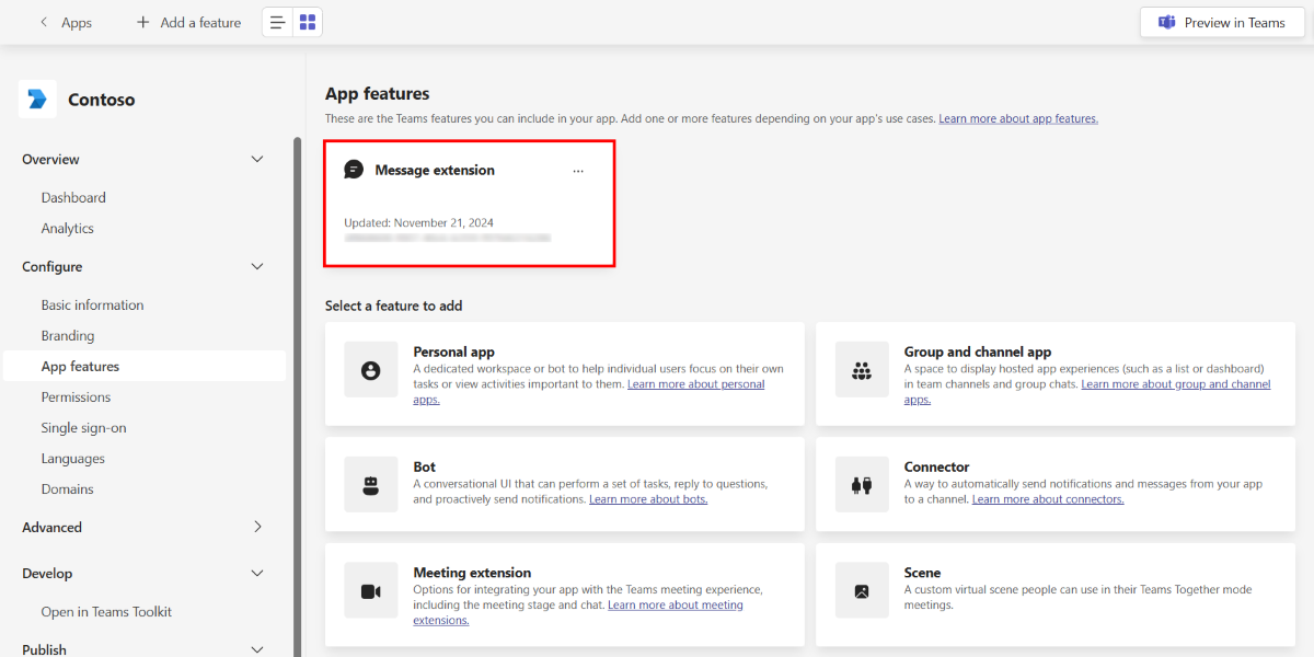{ "$schema": "https://developer.microsoft.com/json-schemas/teams/v1.17/MicrosoftTeams.schema.json", + "manifestVersion": "1.17", "version": "1.0.0", "id": "04805b4b-xxxx-xxxx-xxxx-4dbc1cac8f89", "packageName": "com.microsoft.teams.extension", "developer": { "name": "Teams App, Inc.", "websiteUrl": "https://www.example.com", "privacyUrl": "https://www.example.com/termofuse", "termsOfUseUrl": "https://www.example.com/privacy" }, "icons": { "color": "color.png", "outline": "outline.png" }, "name": { "short": "AI tools", "full": "AI tools" }, "description": { "short": "AI tools", "full": "AI tools" }, "accentColor": "#FFFFFF", "composeExtensions": [ { + "composeExtensionType": "apiBased", + "authorization": { + "authType": "apiSecretServiceAuth ", + "apiSecretServiceAuthConfiguration": { + "apiSecretRegistrationId": "9xxxxxxx-7xxx-4xxx-bxxx-1xxxxxxxxxxx" + } + }, + "apiSpecificationFile": "aitools-openapi.yml", "commands": [ { "id": "searchTools", "type": "query", "context": [ "compose", "commandBox" ], "title": "search for AI tools", "description": "search for AI tools", "parameters": [ { "name": "search", "title": "search query", "description": "e.g. search='tool to create music'" } ], + "apiResponseRenderingTemplateFile": "response-template.json" } ] } ], "validDomains": [] }