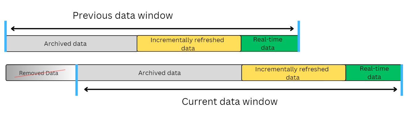 Incremental refresh improves update performance and offers several benefits. This refresh method works by defining a data window for data archival, incremental refresh, and real-time data (when supported).