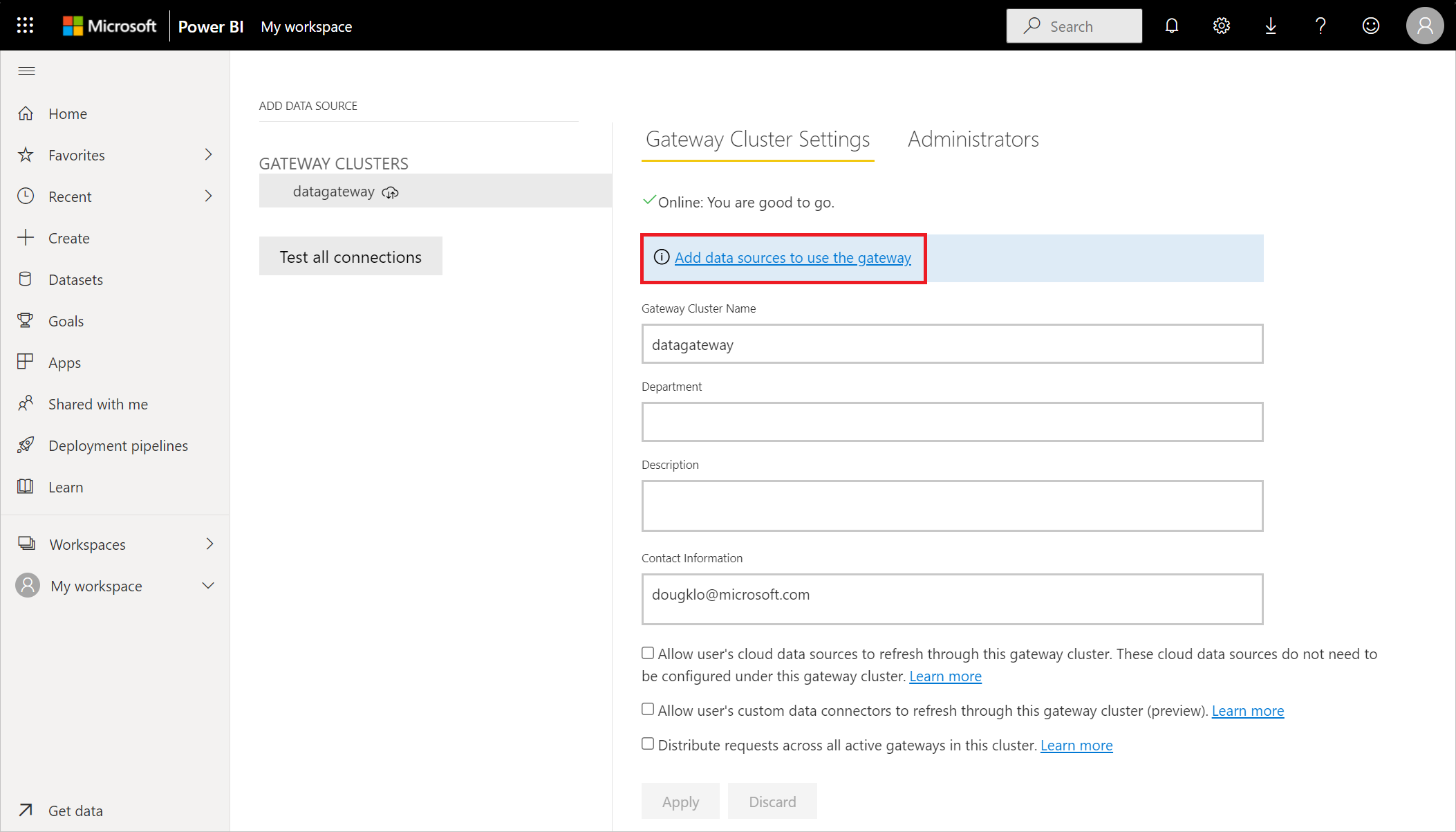 In Add Data Source, select Add data sources to use the gateway.