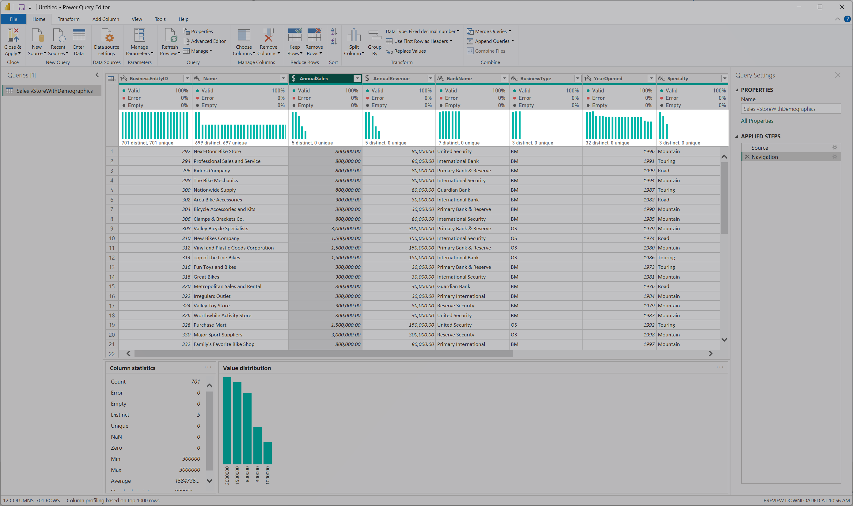 After you enable the options, the data profiling information displays in the Power Query editor.