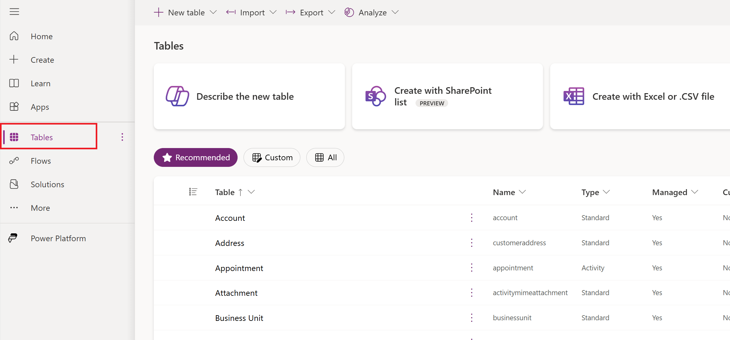 Under Dataverse (near the left edge), select Tables to show the list of tables in your database.