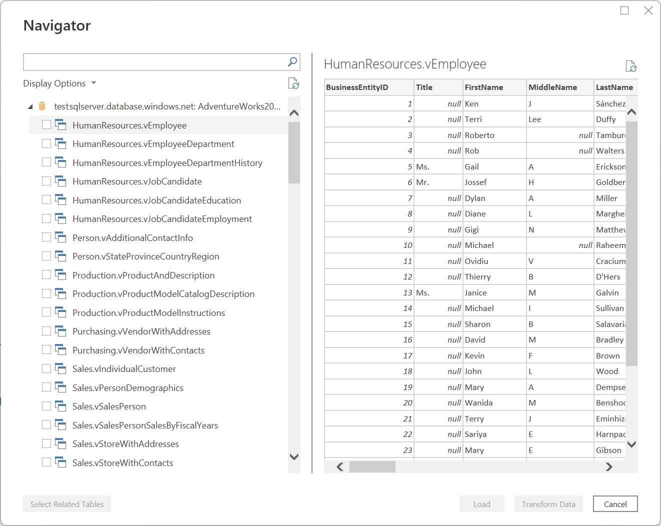 For Power Query in Excel, select the Select multiple items option from the upper-left corner of the navigation window to select more than one object at a time in the object selection pane.