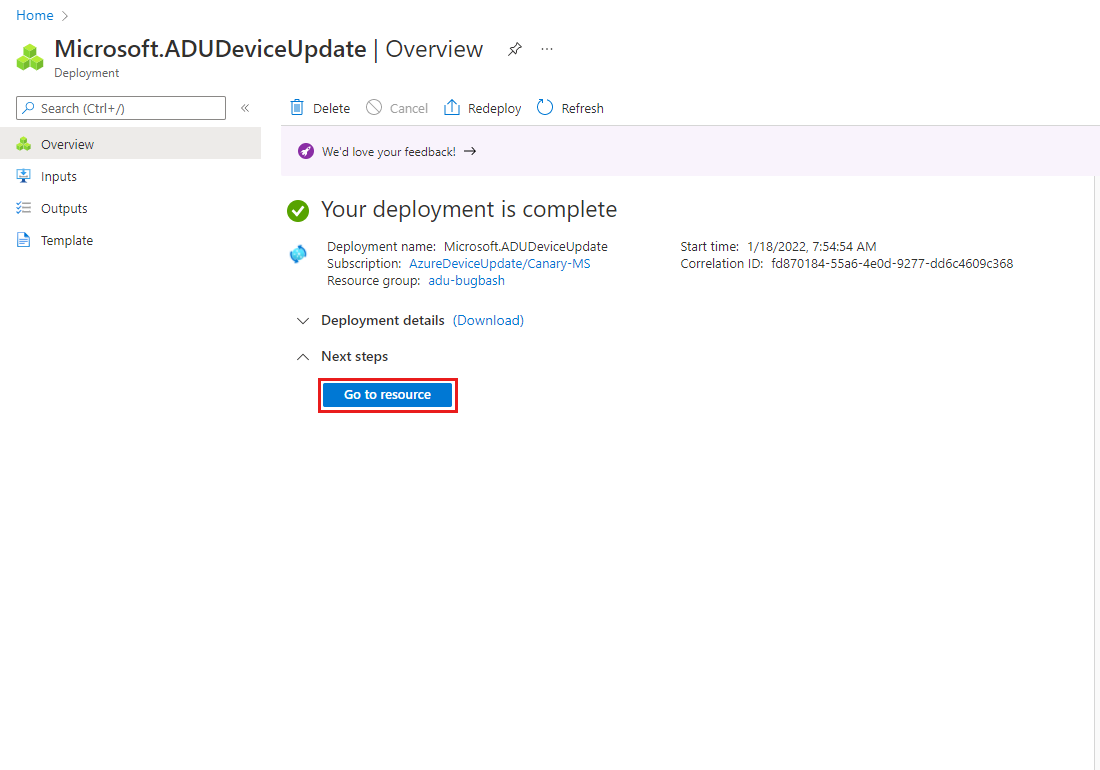 You'll see that your deployment is in progress. The deployment status will change to "complete" in a few minutes. When it does, select Go to resource